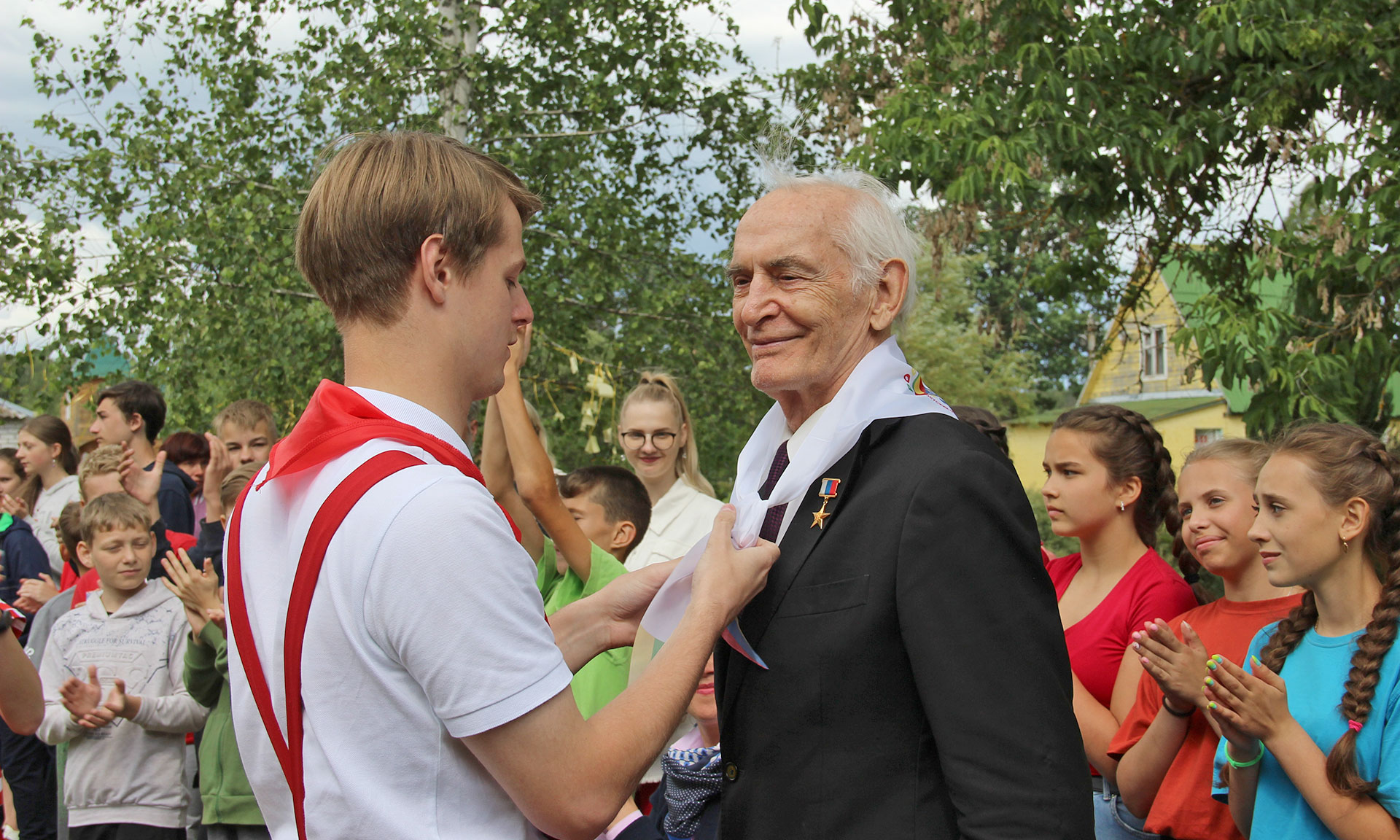 Народного артиста встречали бурными аплодисментами все отряды «Ровесника». По сложившейся традиции почетному гостю показали приветствия и девизы каждого отряда, творческие номера, подготовленные отдыхающими ребятами и вожатыми. Одним из сюрпризов торжественной линейки стало посвящение Василия Семеновича в ряды «Ровесников» — после того, как народному артисту повязали галстук, он стал полноправным «Ровесником». Как пошутили сами педагоги: теперь Василий Семенович может смело вступить в ряды вожатых!