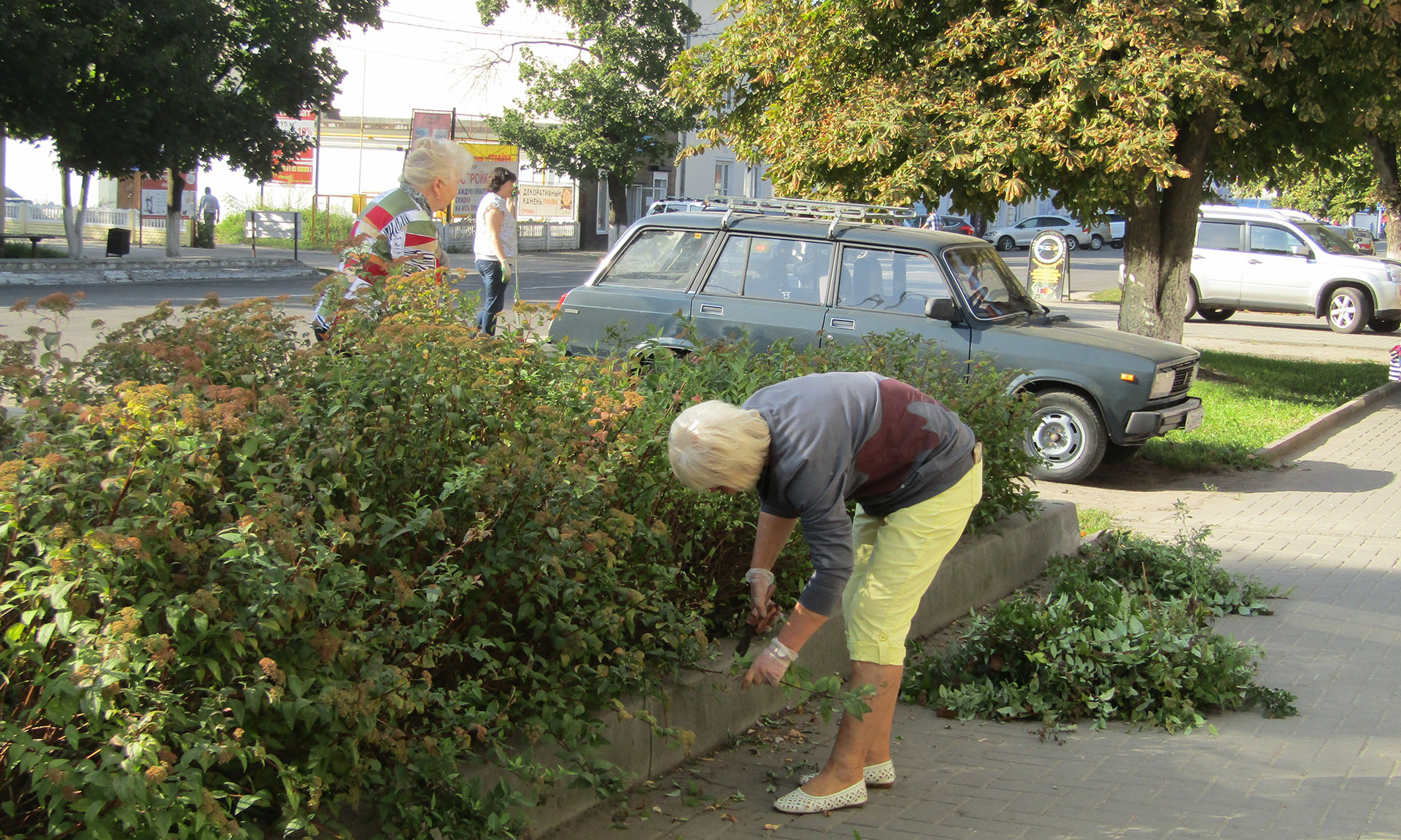 Но основные трудовые силы были направлены на уборку территорий городских скверов, которые благоустраиваются по нацпроекту «Комфортная городская среда». На центральной площади города обрезали декоративные кусты.