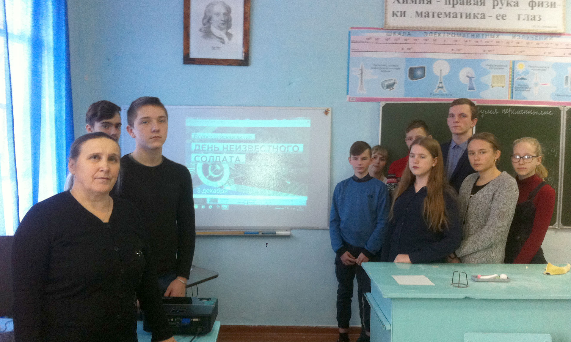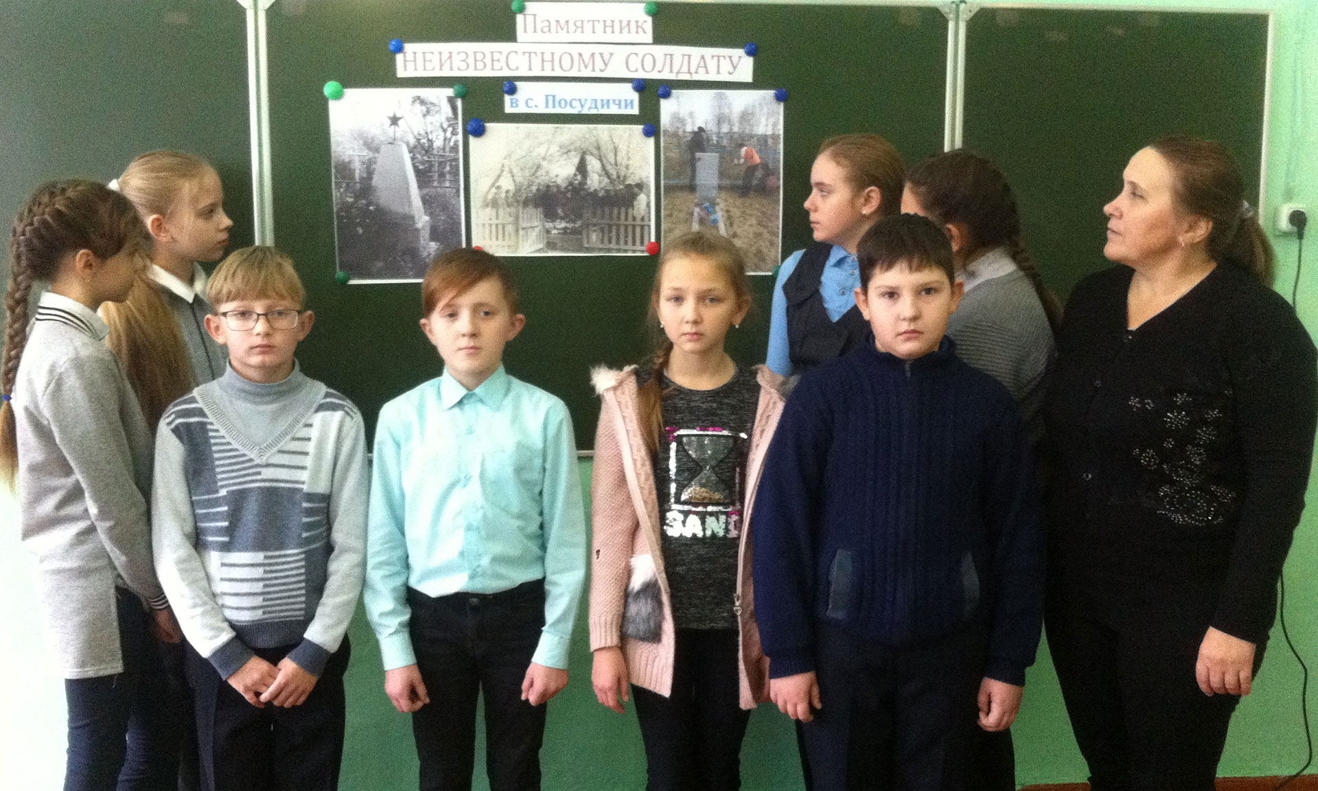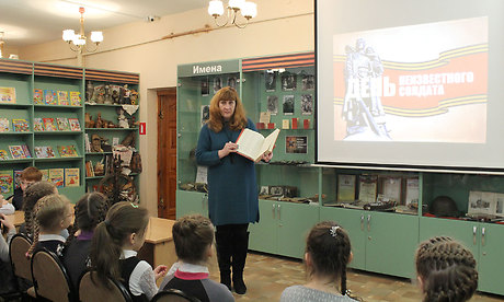 В Мастерской патриотических идей Навлинской основной школы и «Точке Памяти» Дятьковской школы № 5 состоялась акция «Помним тебя, неизвестный солдат». Активисты «Точки Памяти» Унечской межпоселенческой центральной библиотеки Мария Шилова, Юлия Пыряева и Мария Кривоносова встретились с учащимися начальных классов школ № 2 и № 3. Рассказали о поисковых базах в сети Интернет. Юные поисковики представили страницы «Книги доблести и памяти» библиотеки, а также познакомили школьников с историей создания мемориального ансамбля «Могила Неизвестного солдата». В «Точке Памяти» Карачевской районной библиотеки состоялся Патриотический экскурс «Неизвестный солдат», в ходе которого участники мероприятия познакомились с памятниками Неизвестному Солдату в России и за рубежом. Школьники из «Точки Памяти» в Погаре провели исторический экскурс «Я камнем стал, но я живу» на базе Посудичской основной общеобразовательной школы. В Супоневской школе № 2 Брянского района также прошел ряд памятных мероприятий. Учащиеся 10 класса Тимур Газдиев Тимур, Даниил Дворцов и Дарья Кистень подготовили патриотические пятиминутки для учащихся 4–7 классов.