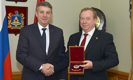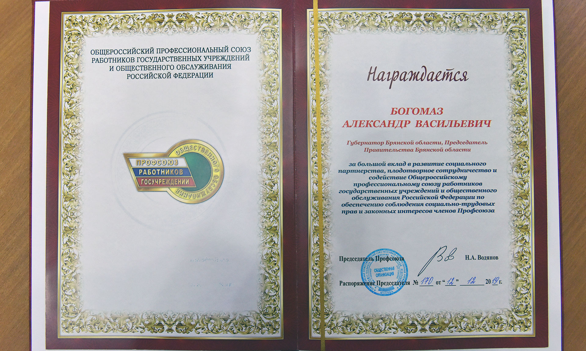Николай Водянов вручил Губернатору Брянской области Александру Богомазу Благодарность председателя Профсоюза за большой вклад в развитие социального партнерства, плодотворное сотрудничество и содействие Общественному профессиональному союзу работников государственных учреждений и общественного обслуживание Российской Федерации по обеспечению соблюдения социально-трудовых прав и законных интересов членов Профсоюза.