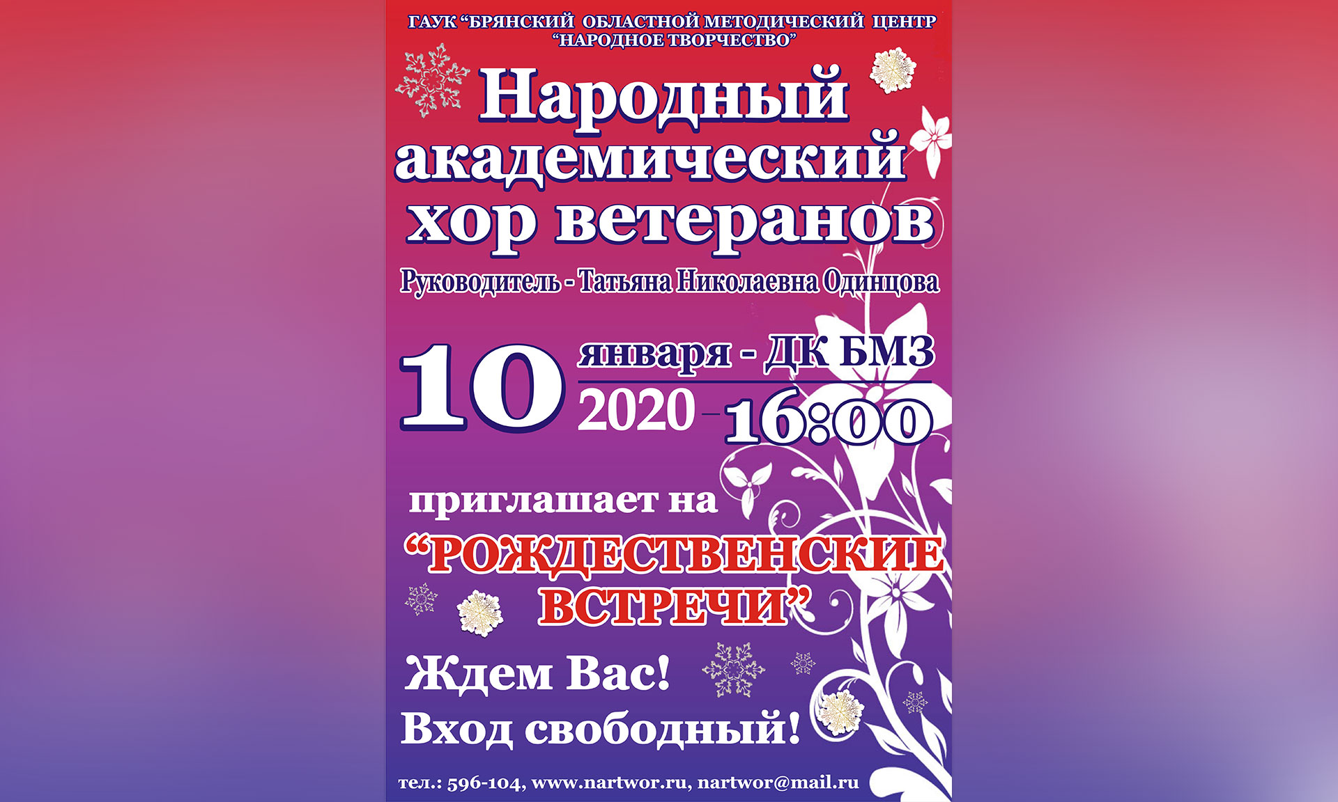 Ждем Вас 10 января во Дворце культуры БМЗ Брянского областного методического центра «Народное творчество». Начало концерта в 16:00.