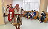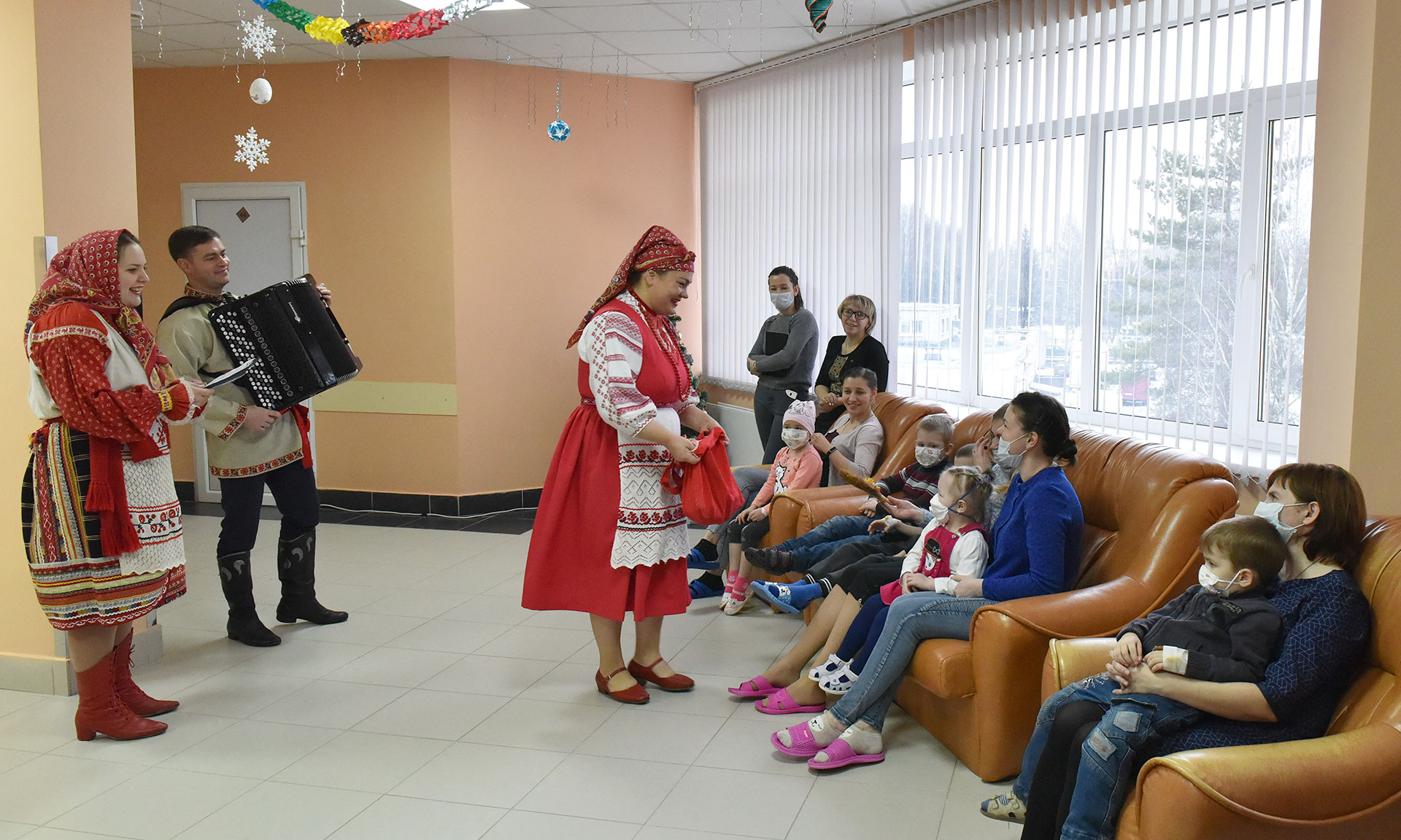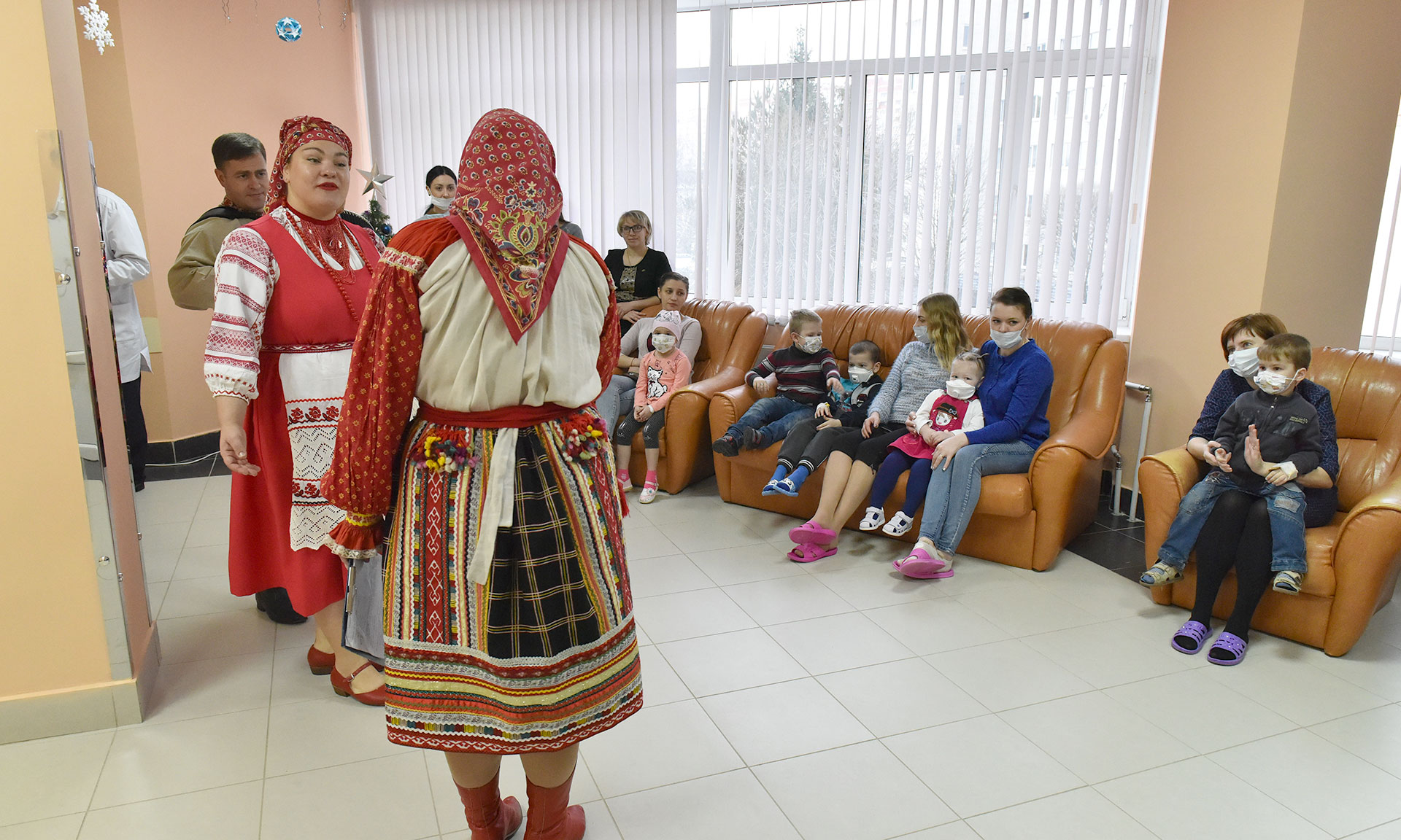 В исполнении ансамбля прозвучали календарные обрядовые песни и пожелания. Маленьких пациентов ждали зимние загадки и игры.