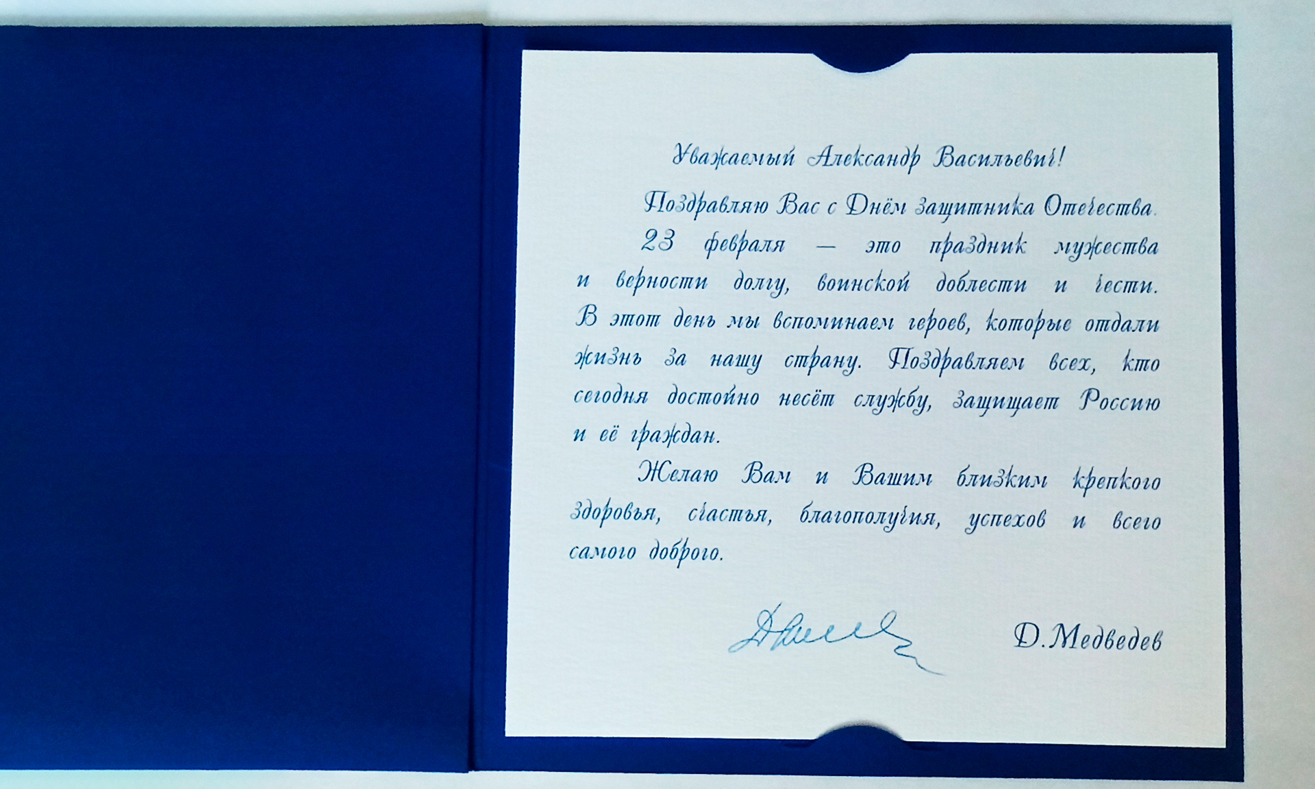 Поздравляю Вас с Днем защитника Отечества. 23 февраля — это праздник мужества и верности долгу, воинской доблести и чести. В этот день мы вспоминаем героев, которые отдали жизнь за нашу страну. Поздравляем всех, кто сегодня достойно несет службу, защищает Россию и ее граждан. Желаю Вам и Вашим близким крепкого здоровья, благополучия, успехов и всего самого доброго».