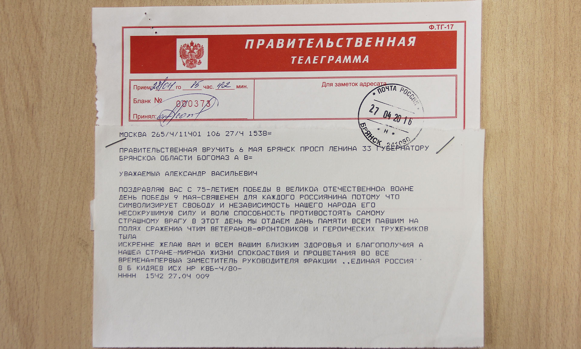 В адрес Губернатора Брянской области Александра Богомаза поступила поздравительная телеграмма от Первого заместителя Руководителя Фракции «Единая Россия» в Государственной Думе Федерального Собрания Российской Федерации, Президента Общероссийского Конгресса муниципальных образований, Председателя Высшего совета «Национальной ассоциации развития местного самоуправления» Виктора Кидяева. В ней, в частности, говорится: