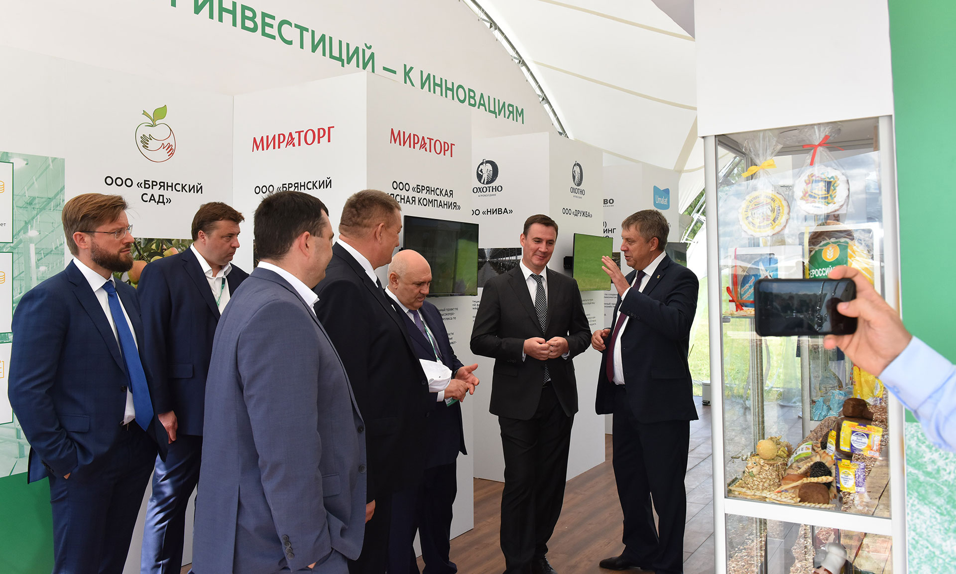 Министр сельского хозяйства РФ Дмитрий Патрушев и Губернатор Брянской области Александр Богомаз посетили павильон региона, представленный в рамках выставки «Всероссийский день поля».