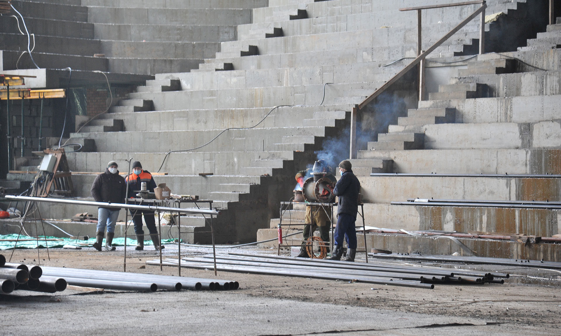 Уже выполнена кирпичная кладка стен, монтаж металлических колонн основной арены с трибунами для зрителей более чем на четыре тысячи мест, завершается устройство кровли над ареной, фасада, пола. То же касается и других блоков: ресторана и конференц-зала, бассейна, реабилитационно-восстановительных помещений, гостиницы, тренировочных и многофункциональных залов. В ближайшие дни здесь будет запущена котельная, и строители приступят к работам внутри здания. Более трехсот человек будут трудиться на отделке и покраске спорткомлекса. Все работы ведутся строго по графику под ежедневным контролем Губернатора Александра Богомаза и врио заместителя Губернатора Сергея Тимошенко.