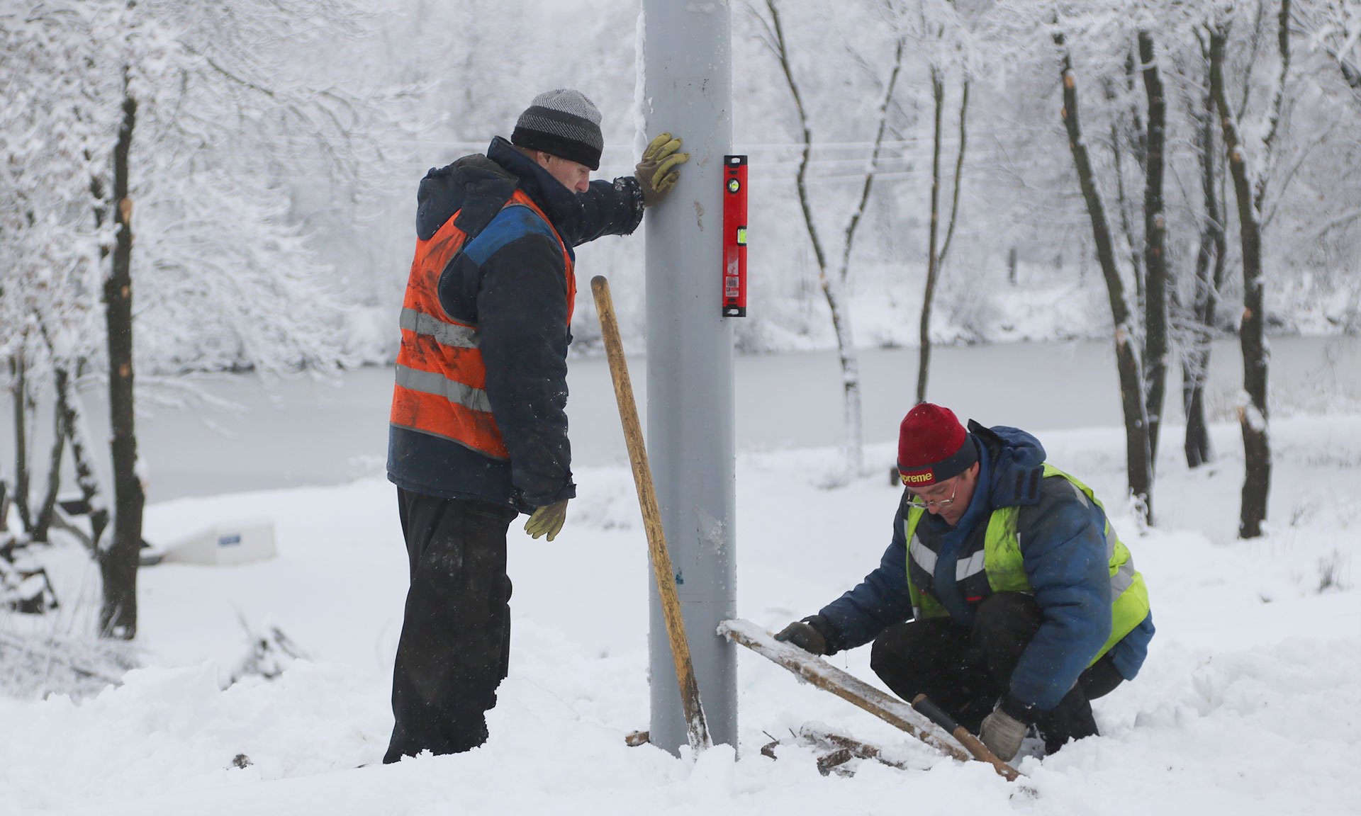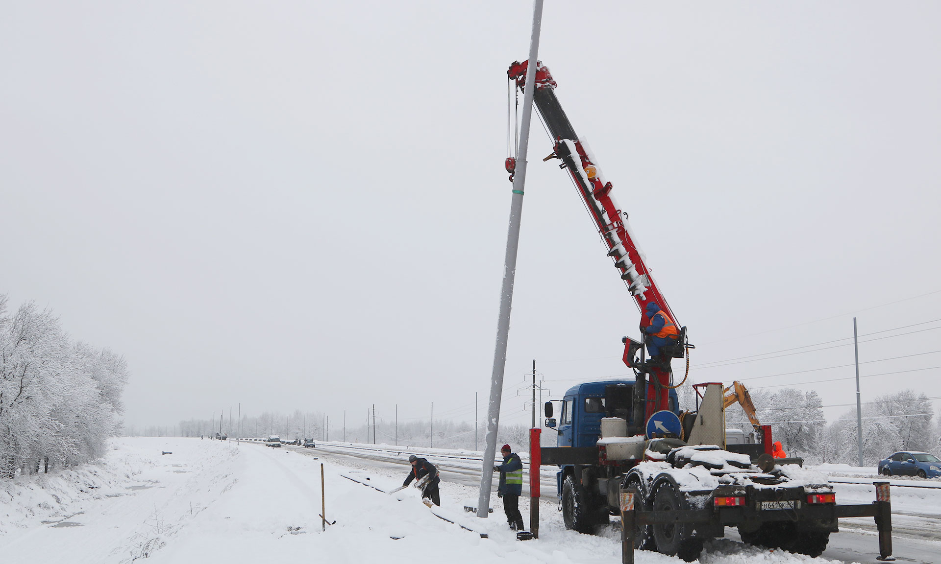На самой дороге на 90% установлен поребрик, такой же объем бортового камня смонтирован на тротуарах, работа продолжается на разделительной полосе. На участке от проспекта Московского до нового моста сейчас устанавливаются опоры электроосвещения. Всего на этом участке их будет около 100, подрядчик уже смонтировал более половины от этого объема. Металлические столбы заглубляются в грунт на два метра и бетонируются. После застывания бетона электрики начнут крепить на них светильники.