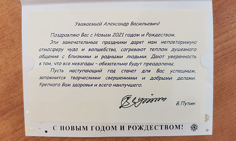Пусть наступающий год станет для Вас успешным, запомнится творческими свершениями и добрыми делами. Крепкого Вам здоровья и всего самого наилучшего».