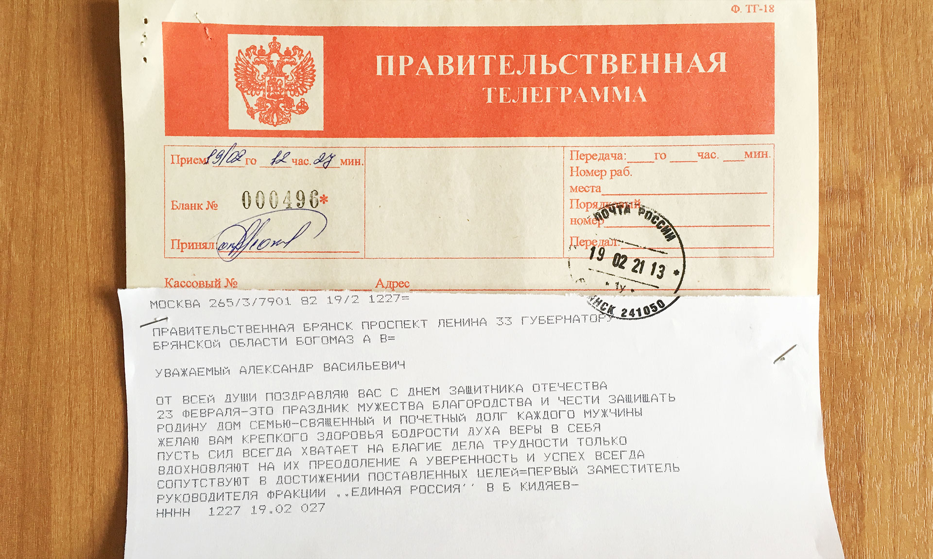 В адрес Губернатора Брянской области Александра Богомаза поступило поздравление от первого заместителя руководителя фракции «Единая Россия» в Государственной Думе Федерального Собрания Российской Федерации, президента Общероссийского Конгресса муниципальных образований, председателя Высшего совета «Национальной ассоциации развития местного самоуправления» Виктора Кидяева.