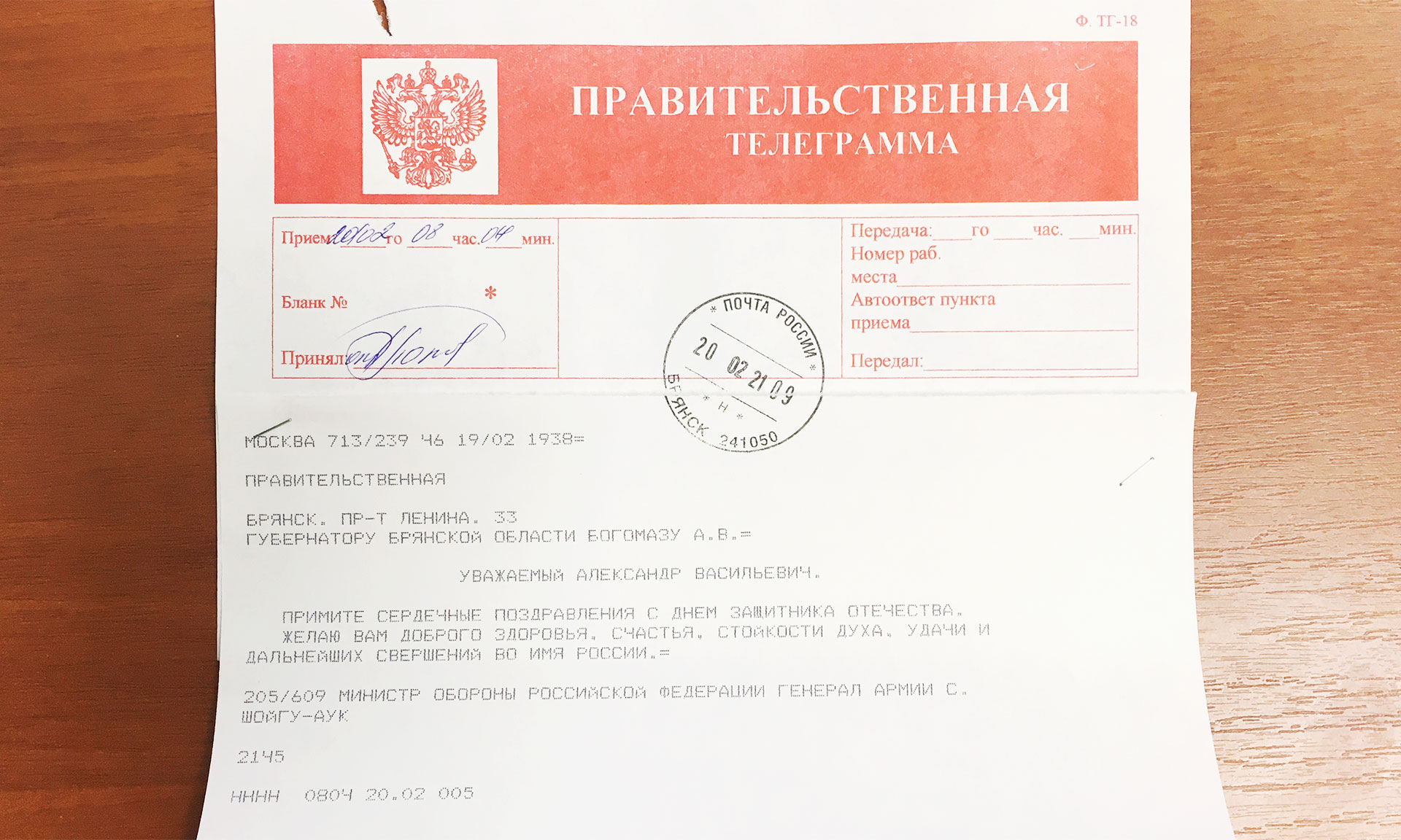 В адрес Губернатора Брянской области Александра Богомаза поступило поздравление от Министра обороны Российской Федерации генерала армии Сергея Шойгу.
