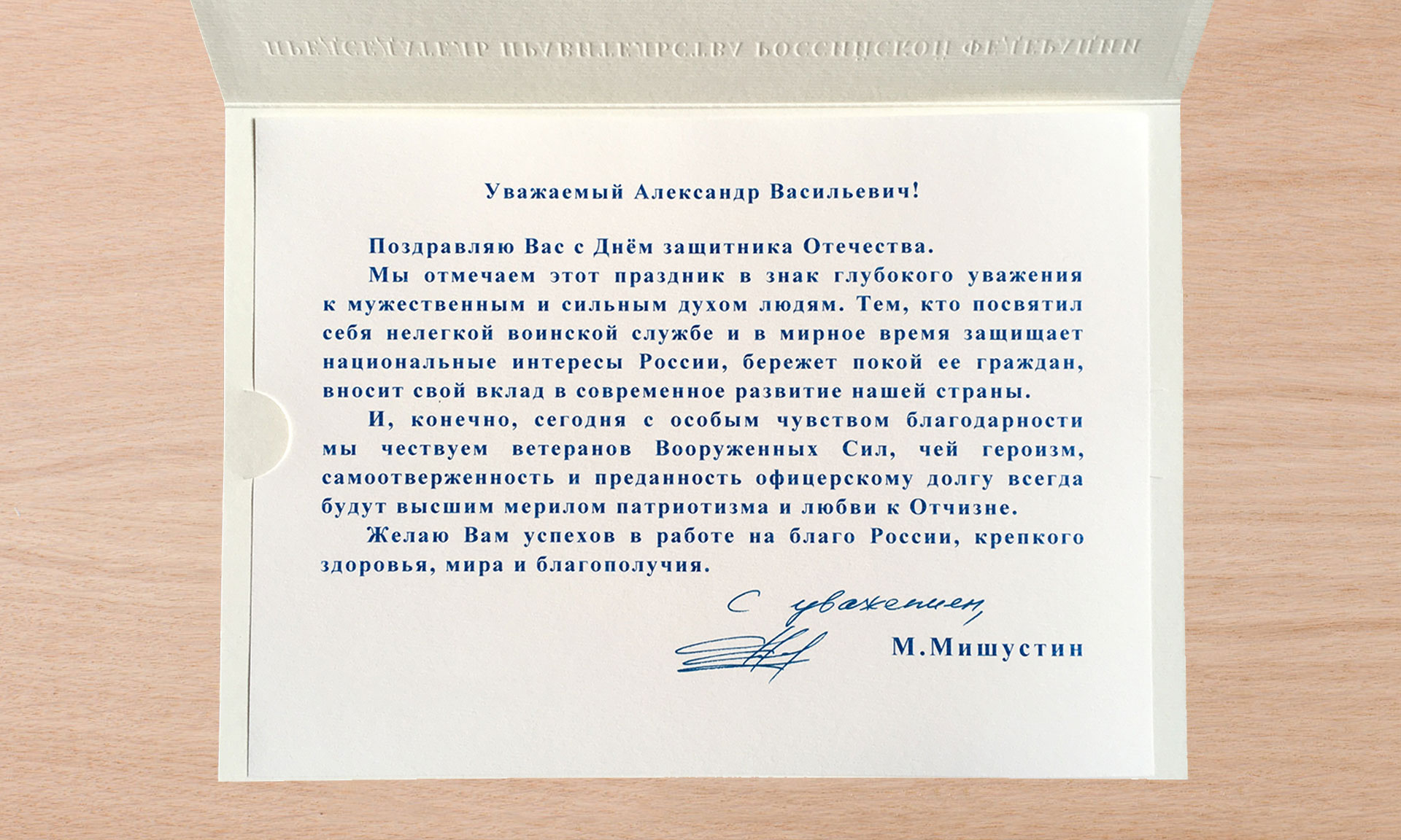 Желаю Вам успехов в работе на благо России, крепкого здоровья, мира и благополучия».
