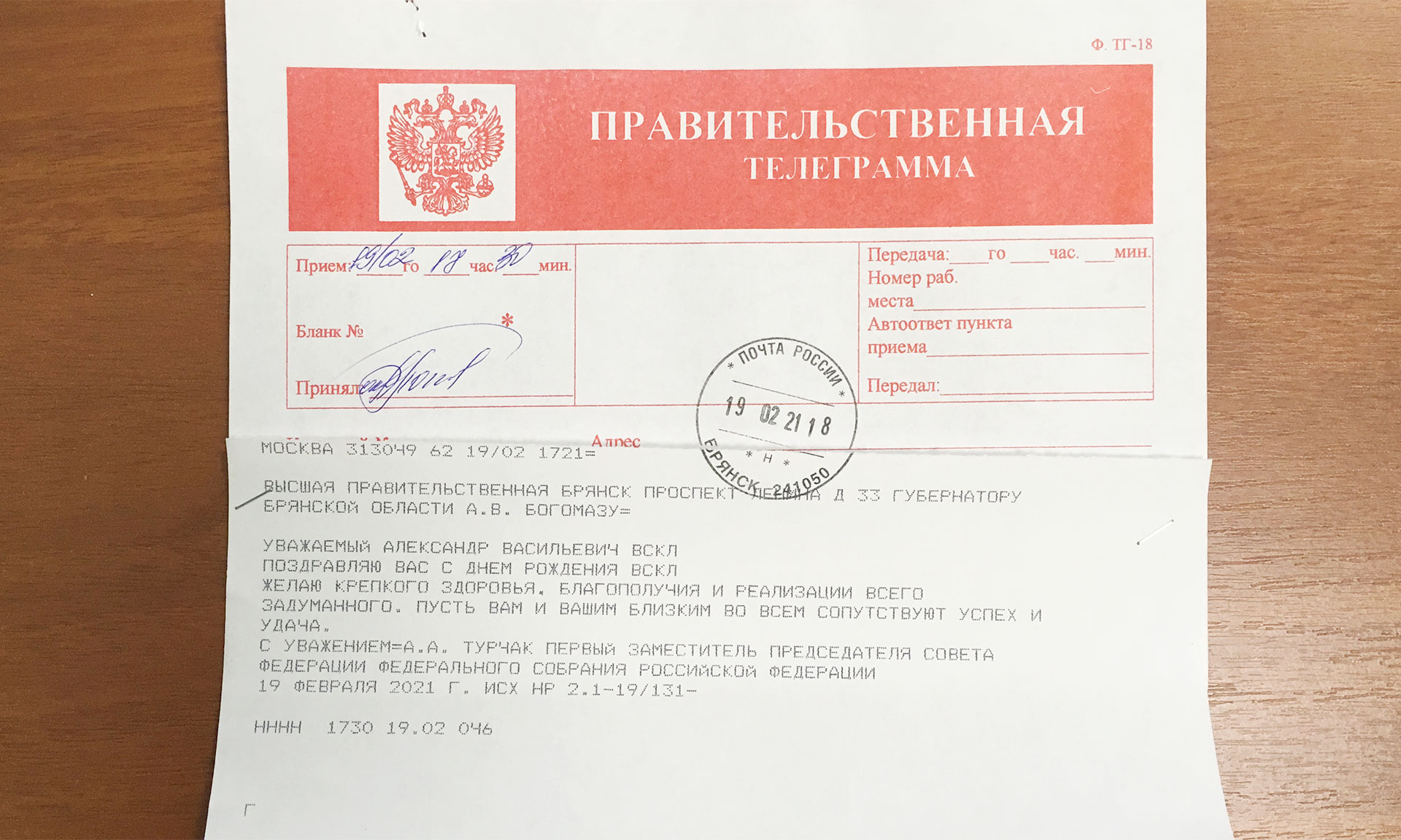 В адрес Александра Богомаза поступило поздравление с Днем рождения от первого заместителя председателя Совета Федерации ФС РФ, секретаря Генерального Совета партии «Единая Россия» Андрея Турчака.