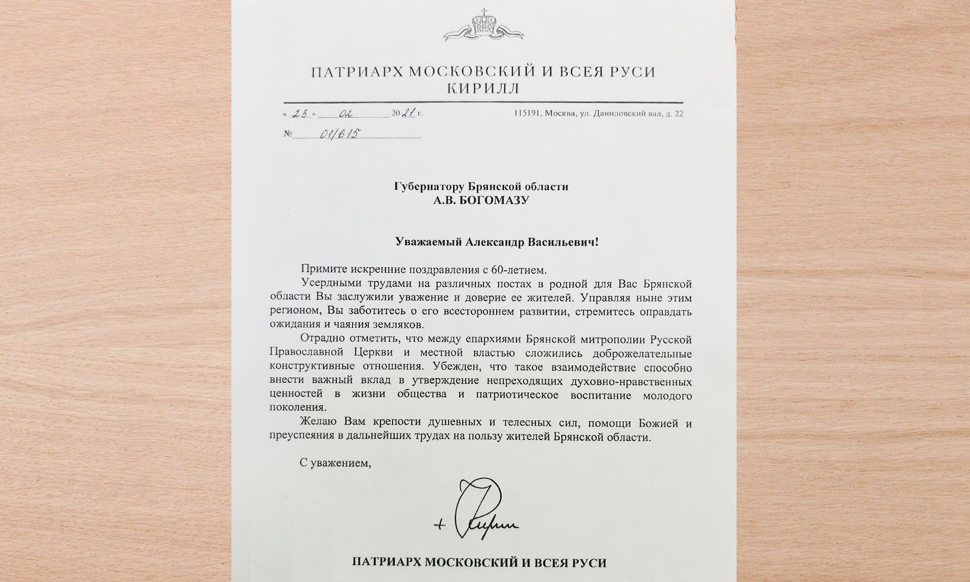 В адрес Александра Богомаза поступило поздравление с Днем рождения от Патриарха Московского и Всея Руси Кирилла. В поздравлении, в частности, говорится: