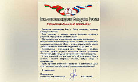 Сердечно поздравляю Вас с Днем единения народов Беларуси и России! Этот праздник — символ нашего братства, духовного родства и неразрывной близости судеб. Мы дорожим тем, что создано за минувшие десятилетия. Общее экономическое пространство, тесное взаимодействие в социально-культурной сфере — лучшее свидетельство наших добрососедских отношений и нерушимости братских уз.