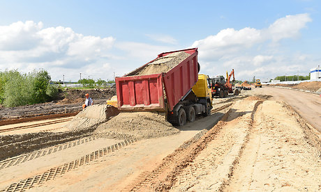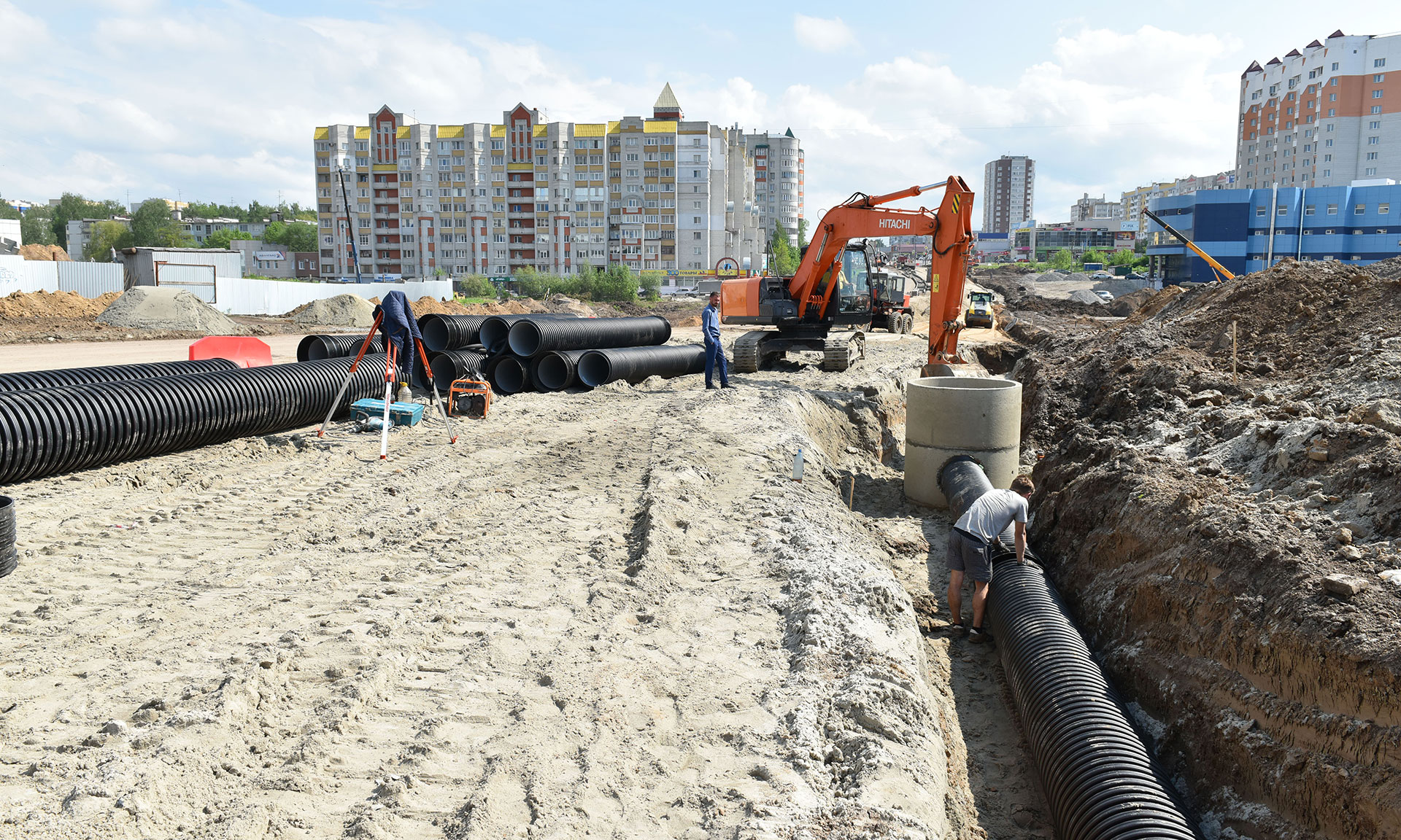 Параллельно выполняется сразу несколько видов работ. Ведётся строительство водопровода, канализации, демонтируются электроопоры, контактная сеть. Продолжается строительство проезжей части. Самосвалы постоянно подвозят грунт. Идёт масштабная подсыпка территории, чтобы на месте оврага сформировать не только дополнительные 2 полосы движения для автомобилей, но и широкий тротуар для пешеходов, которого давно ждали жители микрорайона.