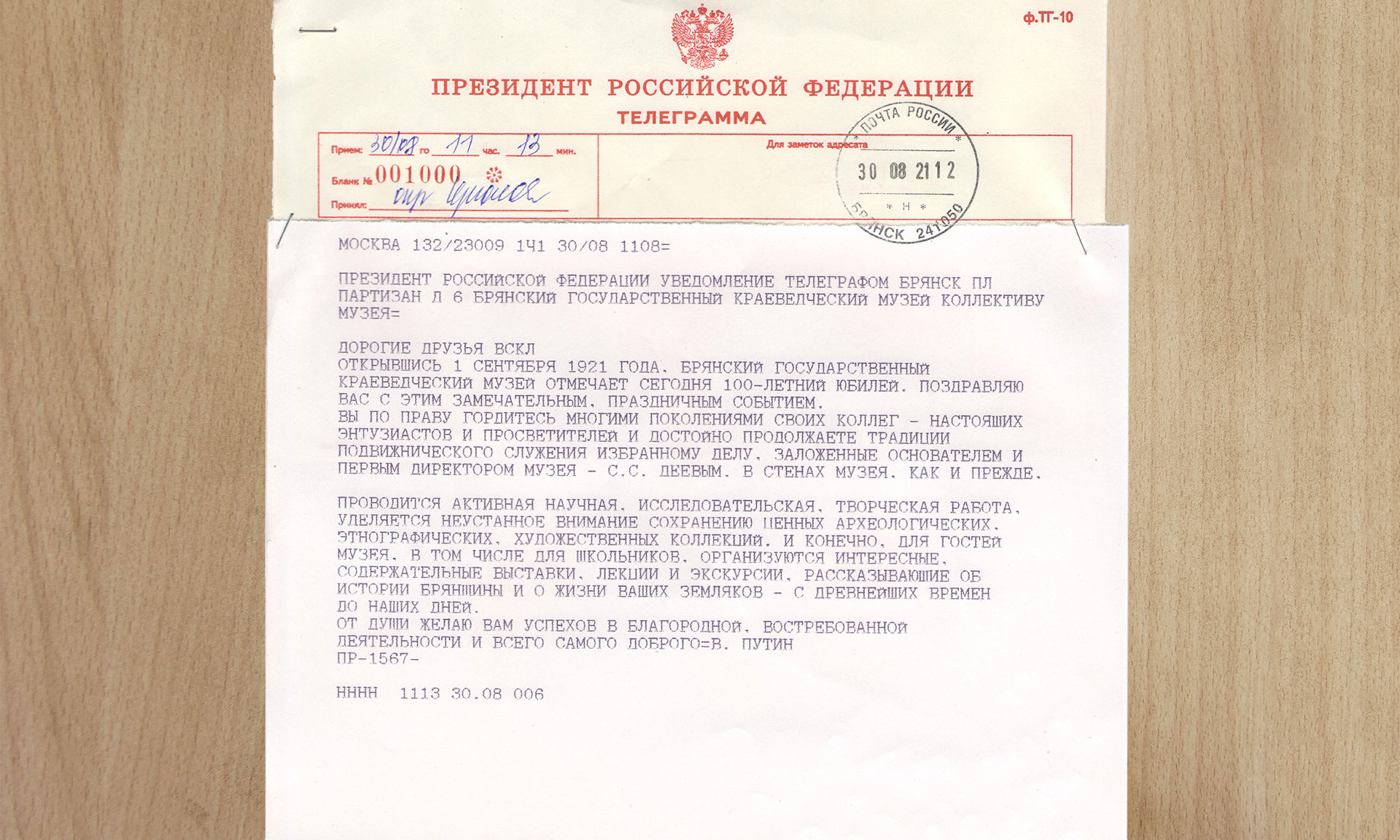 Президент России Владимир Путин поздравил коллектив Брянского государственного краеведческого музея со 100-летним юбилеем. В поздравительной телеграмме, в частности, говорится: