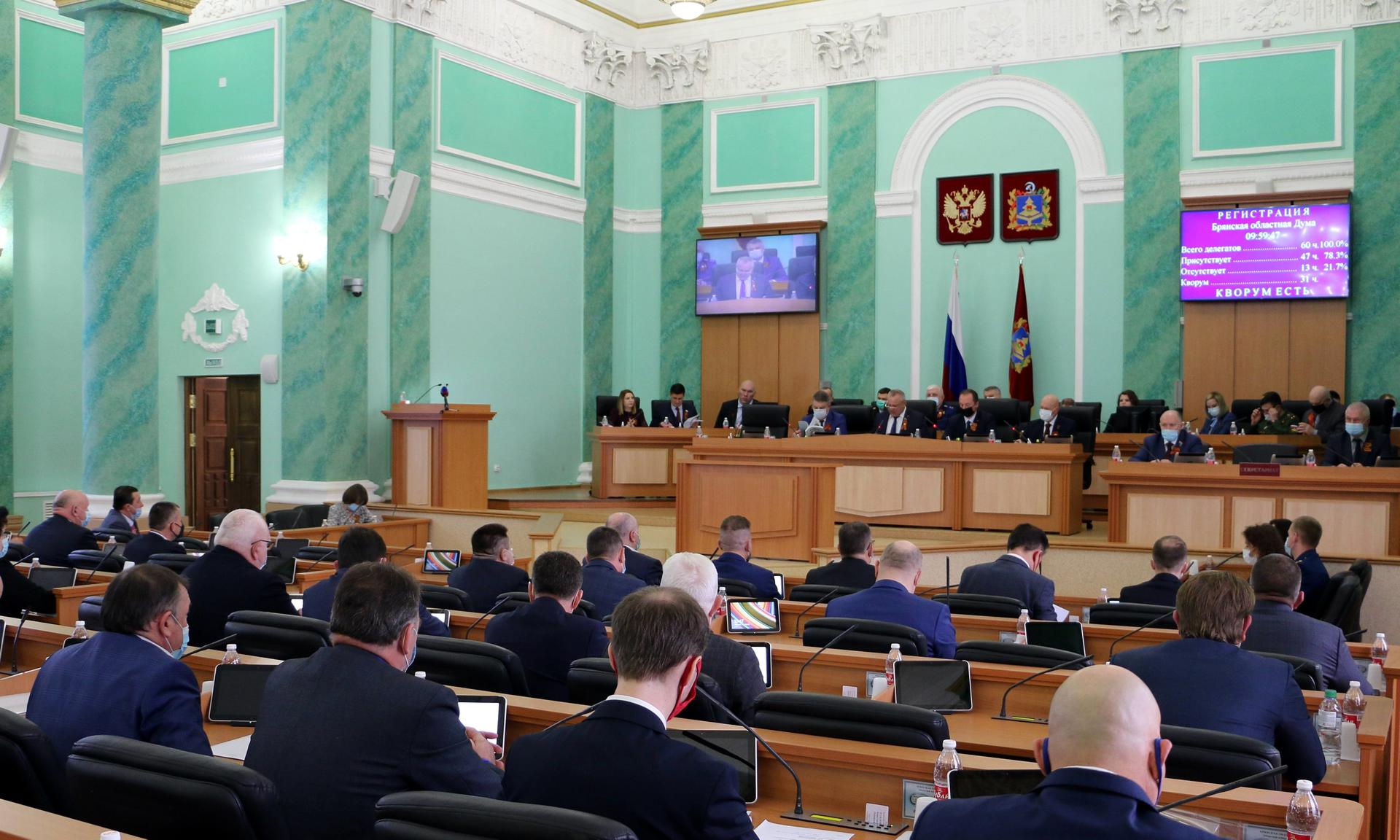 29 апреля состоялось заседание Брянской областной Думы. В работе Думы приняли участие Губернатор Александр Богомаз, председатель Брянской областной Думы Валентин Суббот, главный федеральный инспектор по Брянской области Андрей Дьячук, сенаторы Российской Федерации Галина Солодун и Вадим Деньгин, депутат Государственной Думы Николай Валуев, прокурор Брянской области Александр Войтович, заместитель начальника УМВД России по Брянской области Сергей Григоренко, начальник ГУ МЧС России по Брянской области Вадим Уваркин, военный комиссар Брянской области Марат Урмансов, первый заместитель председателя правления Р ОО «Брянское Землячество» Николай Кондратов, председатель Контрольно-счетной палаты Брянской области Ольга Павлова, заместители Губернатора Брянской области, заместители председателя Брянской областной Думы, руководители органов исполнительной власти региона и главы муниципальных образований.