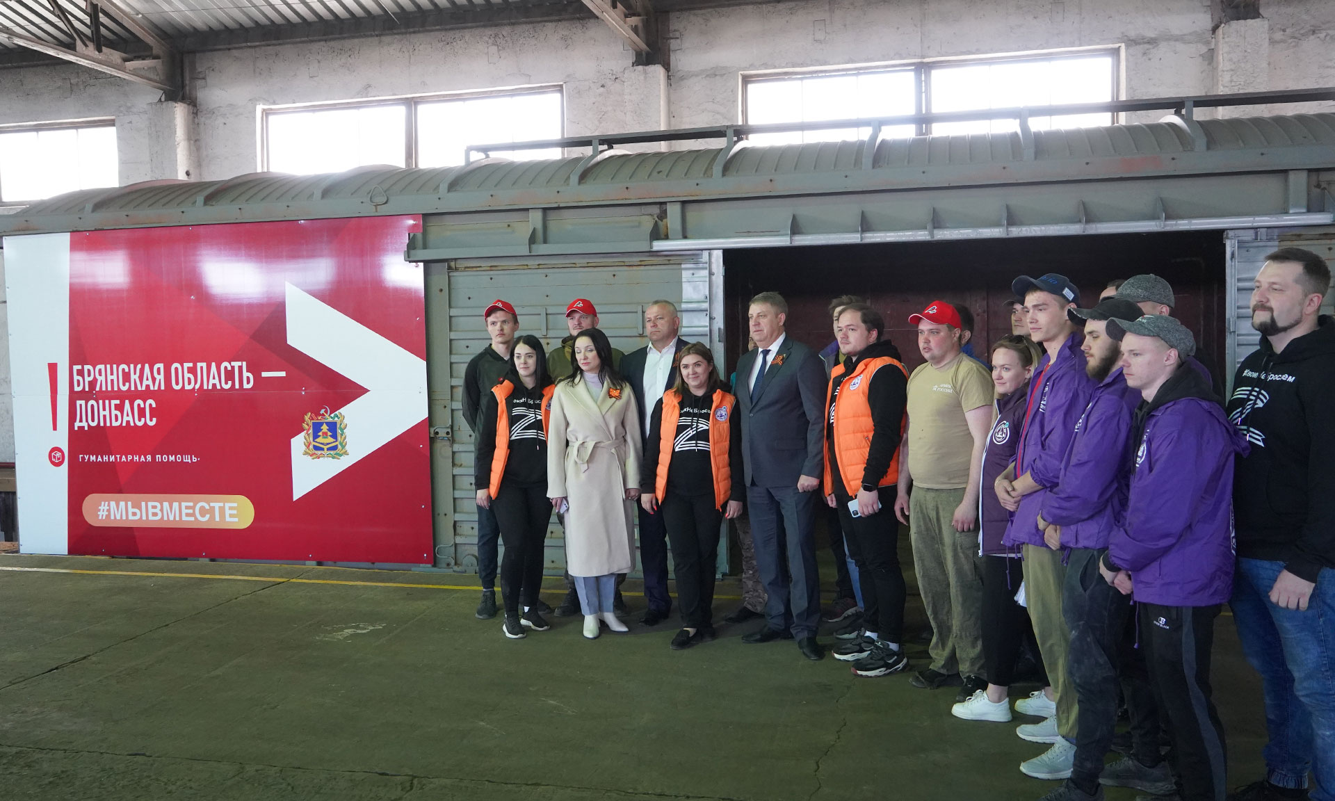 Губернатор Брянской области Александр Богомаз, председатель Брянской областной Думы Валентин Суббот, депутаты Брянской областной Думы Михаил Иванов, Роман Мимонов, руководитель регионального исполкома ОНФ Лариса Третьякова пообщались с волонтерами на погрузке гуманитарного «Поезда помощи Донбассу».