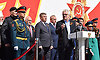 Вдоль строя парадных расчетов перед ветеранами и почетными гостями Государственный Флаг России и Знамя Победы несли лучшие военнослужащие войсковой части 42685: командир знаменной группы Государственного Флага Российской Федерации старший лейтенант Виктор Бирюков, старший лейтенант Евгений Агеев, командир знаменной группы Знамени Победы капитан Игорь Довгалюк, лейтенант Антон Мастеренко.