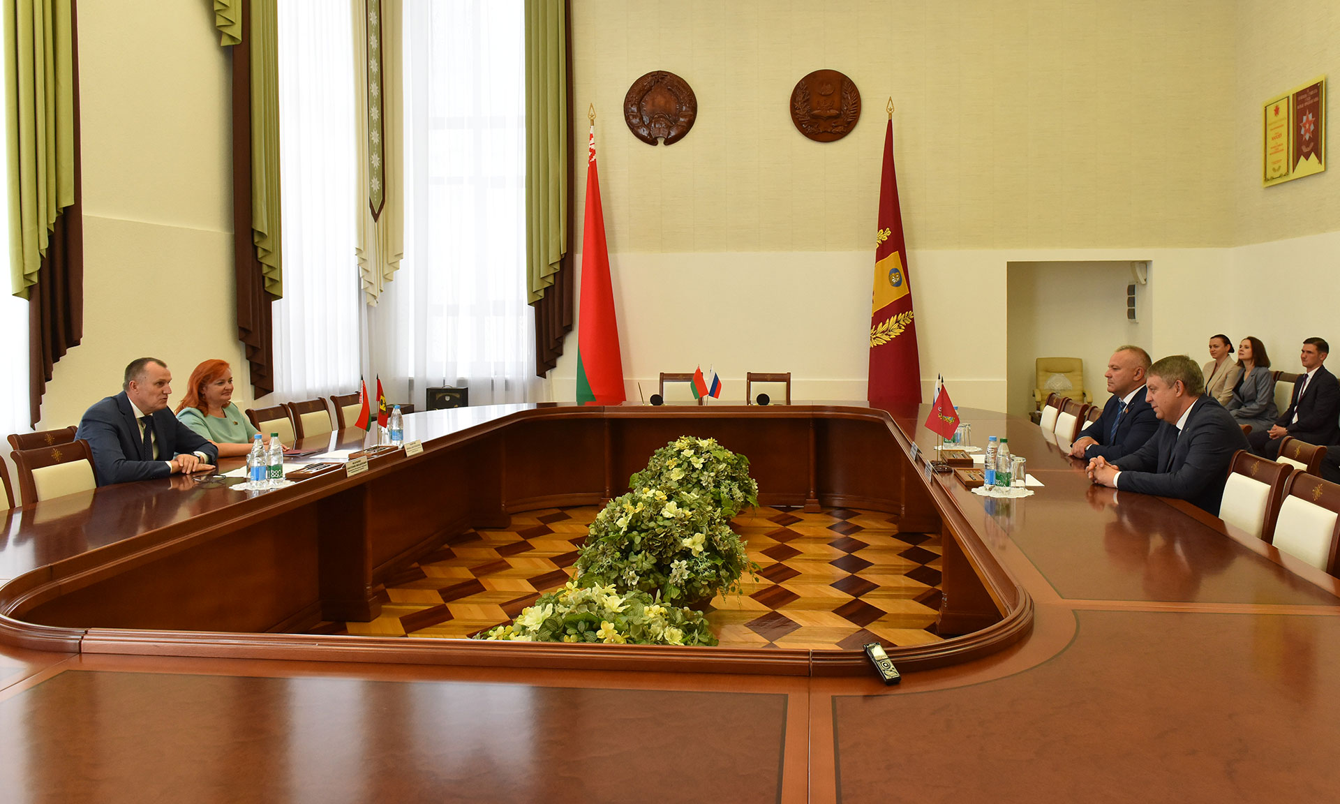 На встрече Александра Богомаза с Анатолием Исаченко и председателем областного Совета депутатов Ириной Раинчик были затронуты вопросы укрепления отношений между нашими регионами.