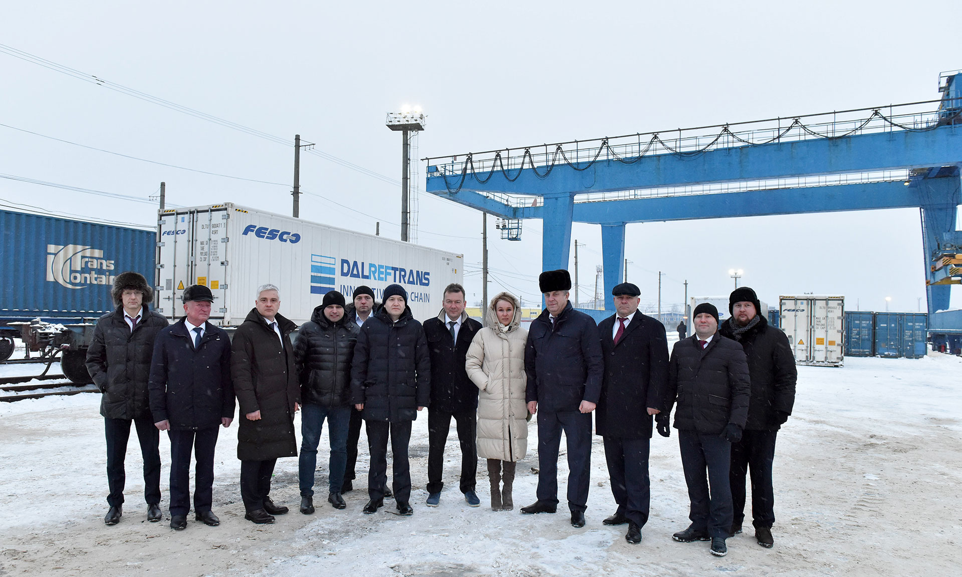 Руководители осмотрели обновленную инфраструктуру станции Брянск-Льговский, где с помощью специальной погрузочной техники продукция грузится на платформы контейнерного поезда, следующего в Китай.