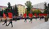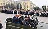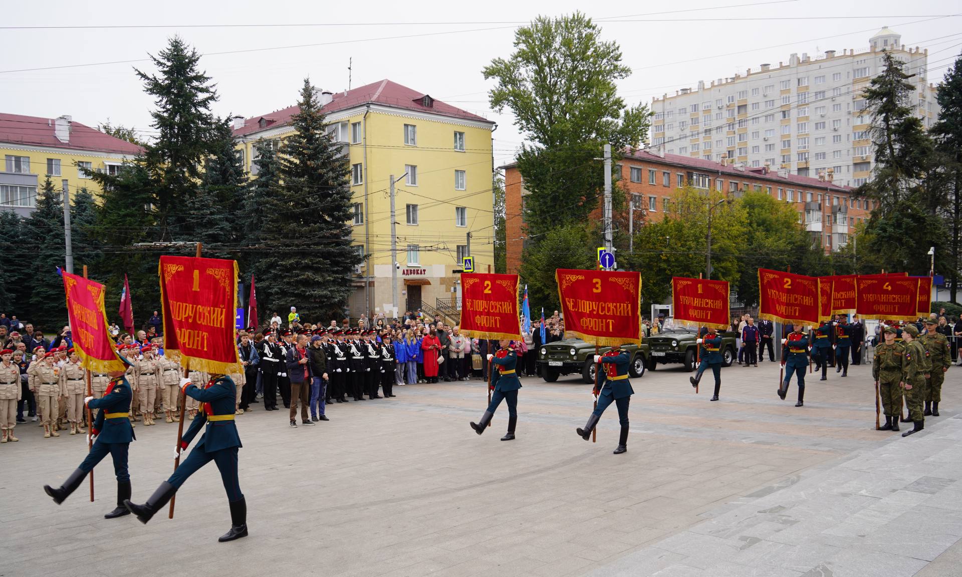 В парадном марше на площади Партизан — штандарты фронтов и соединений, освободивших нашу Родину. Наименования этих фронтов золотыми буквами вписаны в историю нашего региона и России, они символизируют доблесть, честь и отвагу защитников нашей Родины! Штандарты несут продолжатели славных воинских традиций нашей Родины — военнослужащие 154-го отдельного Комендантского Преображенского полка.