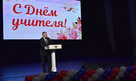 — Дорогие учителя, педагоги дошкольного и дополнительного образования, преподаватели средних и высших учебных заведений, дорогие ветераны отрасли! Я от всей души поздравляю вас с вашим профессиональным праздником, Днём учителя!