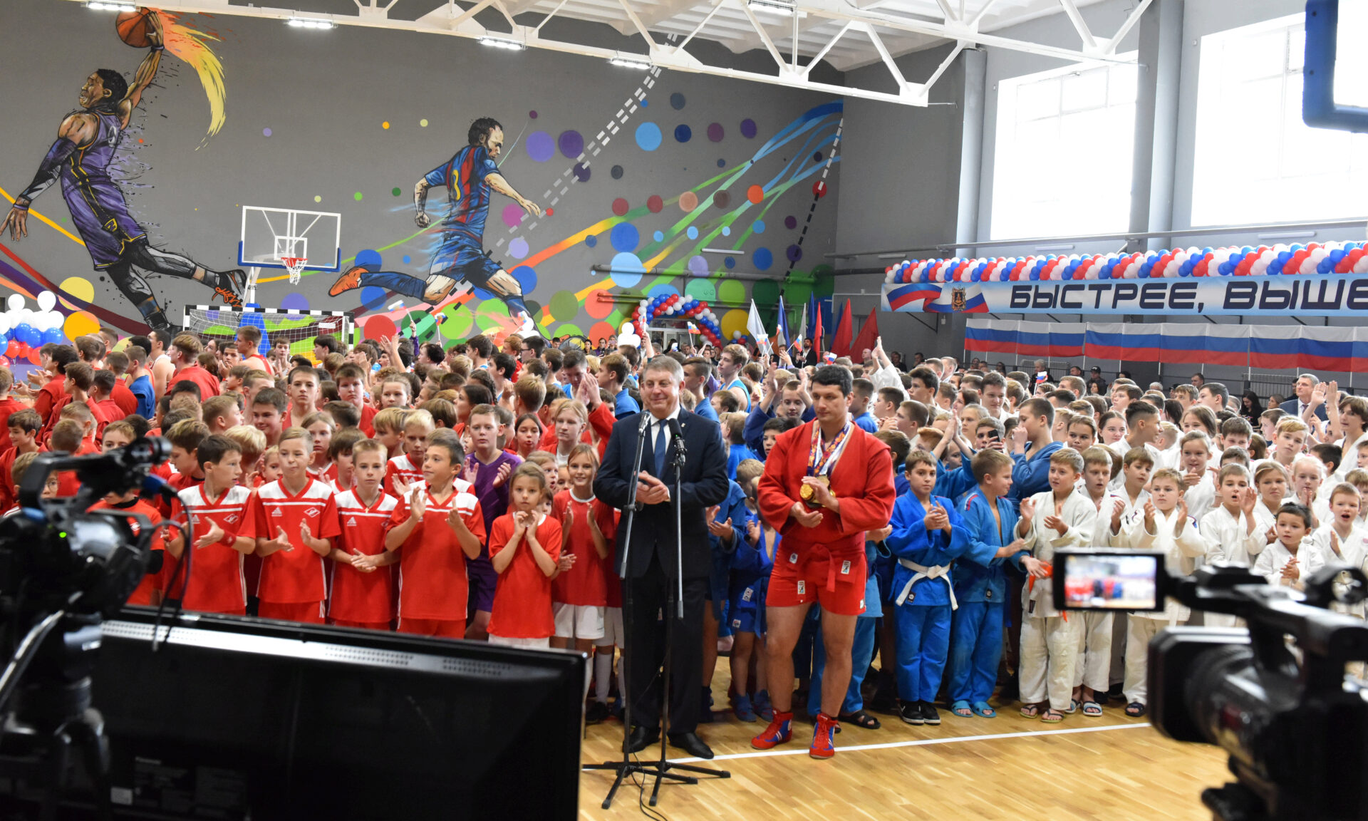 На открытии спортивного комплекса присутствовали Губернатор Брянской области Александр Богомаз, капитан сборной России по самбо, девятикратный чемпионом мира по самбо Артем Осипенко.