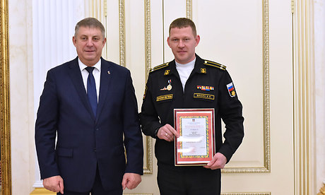 Глава региона наградил Почетной грамотой Губернатора Брянской области за большой личный вклад в патриотического воспитание населения Брянской области награждается капитан 2 ранга, командир атомного ракетного подводного крейсера стратегического назначения «Брянск» Александра Масича.