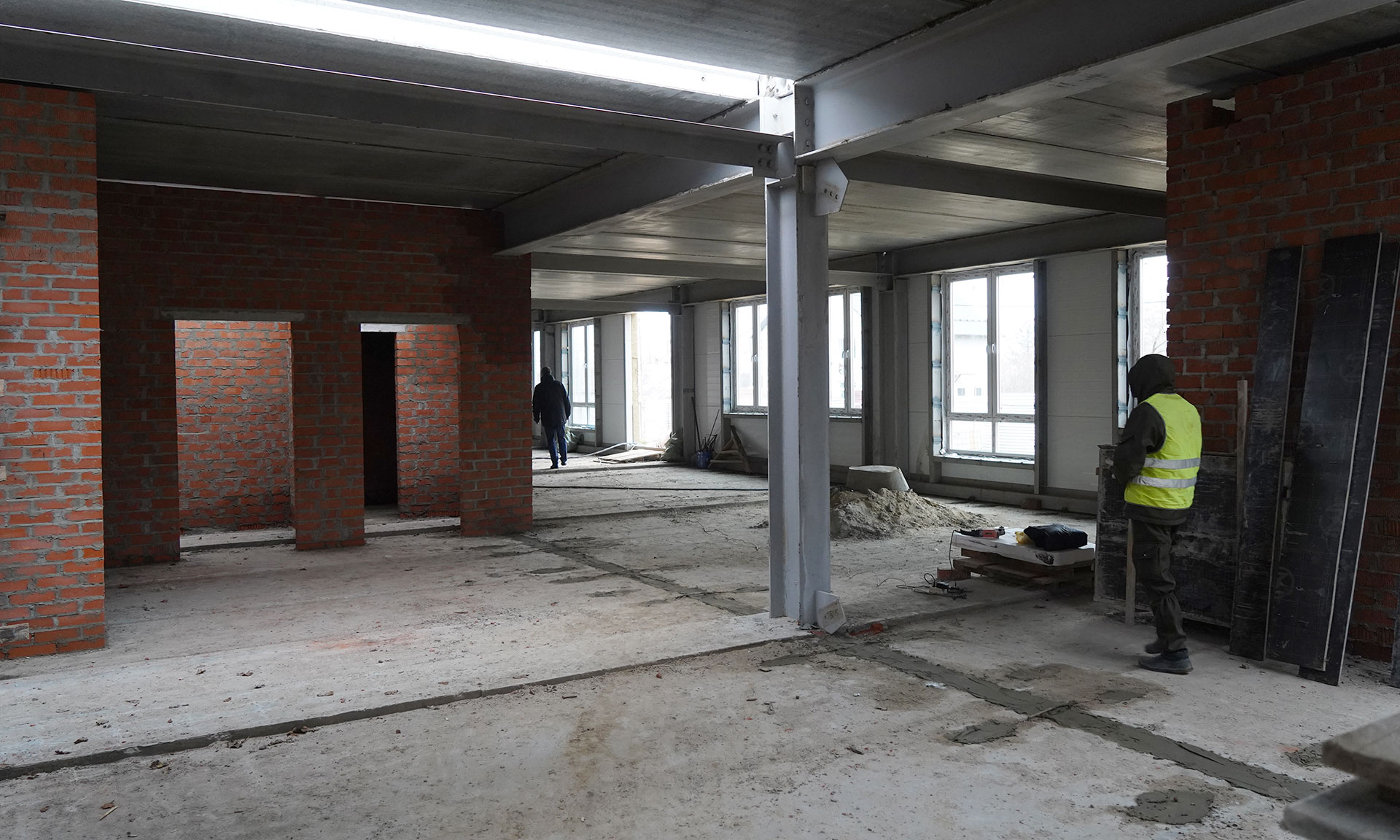 Готовность спорткомплекса — более 50%: возведено само здание, завершены работы с кровлей, выложены межкомнатные перегородки. Сейчас главная задача — поставить окна и смонтировать котельную, которую должны поставить в декабре, чтобы здание было обеспечено теплом и можно было вести отделочные работы.