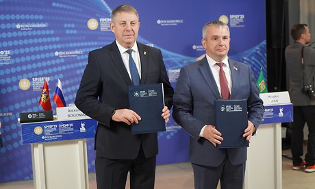 В ходе встречи Губернатор Брянской области Александр Богомаз и председатель Гомельского облисполкома Иван Крупко на полях ПМЭФ’25 обсудили гуманитарные и экономические связи между Брянской и Гомельской областями, а также подписали меморандум по взаимодействию при реализации инвестпроекта между ООО «Термотрон-Завод» и ОАО «Гомельский электротехнический завод».