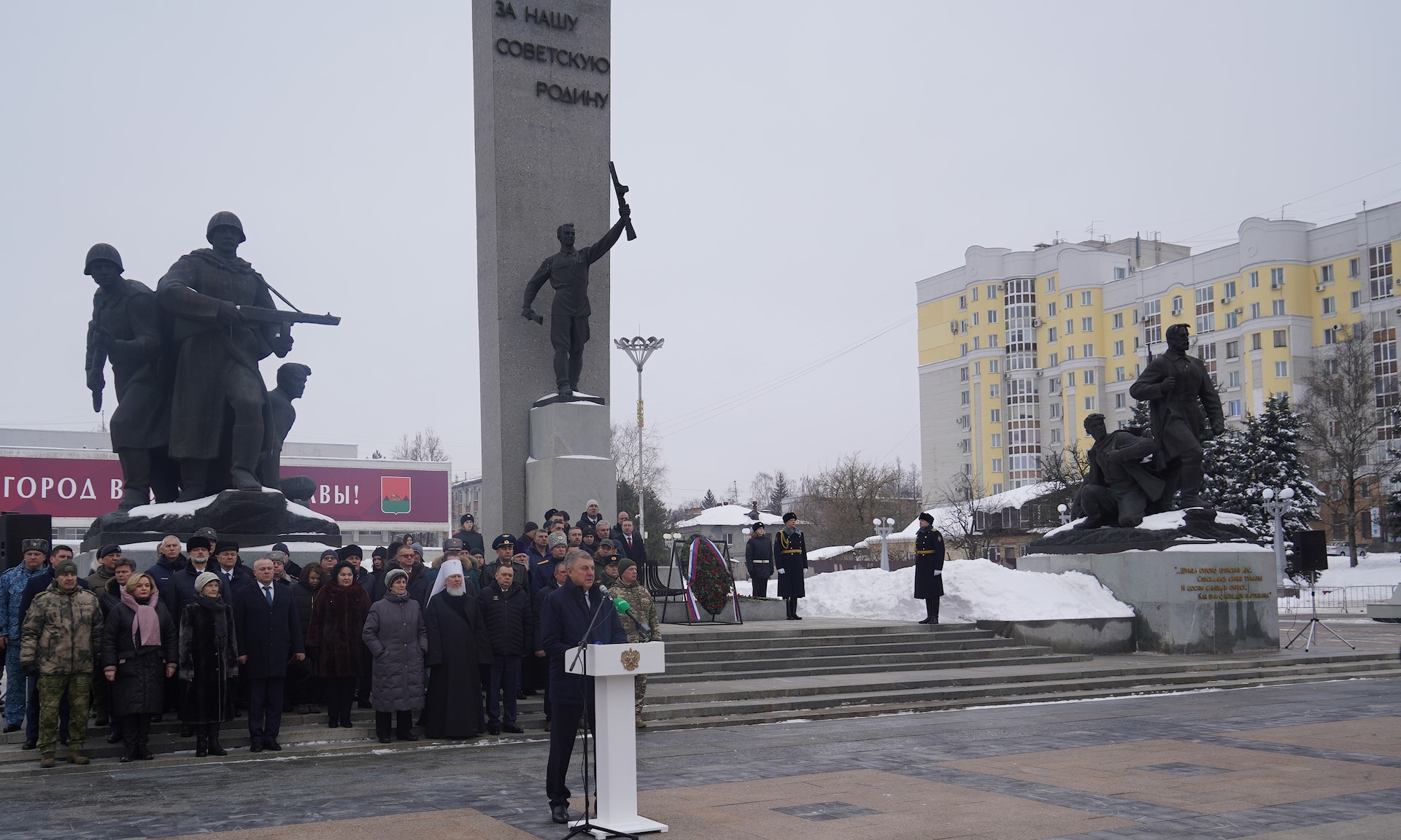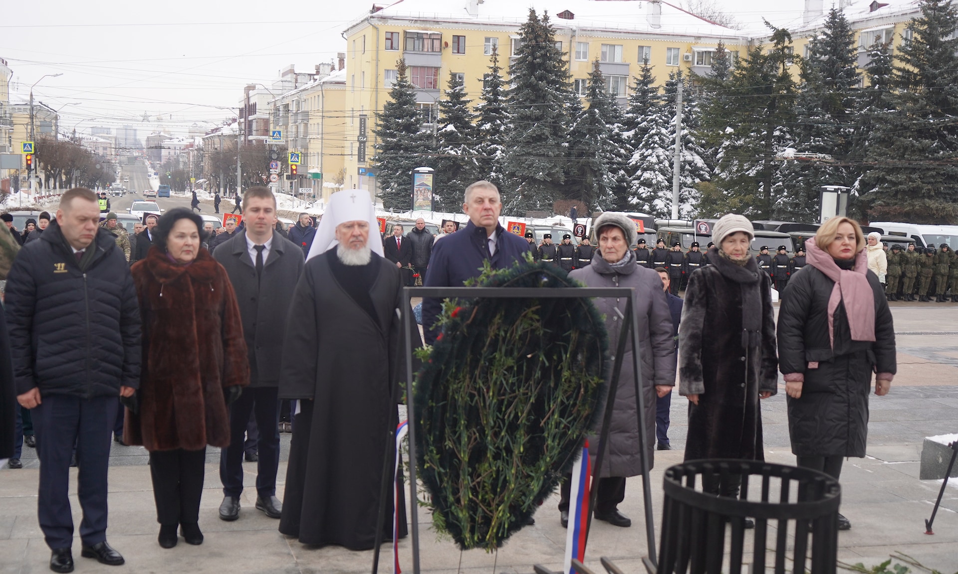В знак памяти и благодарности воинам, отдавшим жизнь за Отечество, цветы к Вечному огню возложили Губернатор Брянской области Александр Богомаз, заместитель председателя Гомельского облисполкома Республики Беларусь Дмитрий Алейников, Митрополит Брянский и Севский Александр, Герои Российской Федерации Александр Постоялко и Андрей Фроленков, мать Героя Российской Федерации Олега Ермакова Лидия Филипповна Ермакова, мать Героя Российской Федерации Сергея Василева Галина Георгиевна Василева, мать погибшего в Сирии офицера Фёдора Журавлёва Людмила Фёдоровна Журавлёва, мать Дмитрия Седнева, награжденного орденом Мужества посмертно, Марина Николаевна Седнева, председатель Брянской областной Думы Валентин Суббот, главный федеральный инспектор по Брянской области Андрей Сергеевич Дьячук, сенаторы Российской Федерации Василий Попадайло и Вадим Деньгин, председатель комитета по физической культуре и спорту Государственной Думы Федерального Собрания Российской Федерации, депутат Государственной Думы от Брянской области Олег Матыцин, депутат Государственной Думы Федерального Собрания Российской Федерации Николай Щеглов, председатель Брянского областного суда Александр Курганов, прокурор Брянской области Владимир Мосин, начальник управления ФСБ России по Брянской области, Сергей Воронин, начальник управления МВД России по Брянской области Алексей Солдатов, руководитель следственного управления Следственного комитета Российской Федерации по Брянской области Алексей Кузьмичёв, начальник управления Федеральной службы войск национальной гвардии Российской Федерации по Брянской области Иван Ванчугов, начальник главного управления МЧС России по Брянской области Дмитрий Енин, начальник Центра специальной связи и информации Федеральной службы охраны Российской Федерации в Брянской области Олег Бельский, руководитель управления ФНС России по Брянской области Андрей Маркелов, руководители правоохранительных органов и силовых структур Брянской области, руководители федеральных территориальных органов государственной власти Брянской области, заместители Губернатора Брянской области, заместители председателя Брянской областной Думы, руководители города Брянска, делегация Республики Беларусь.
