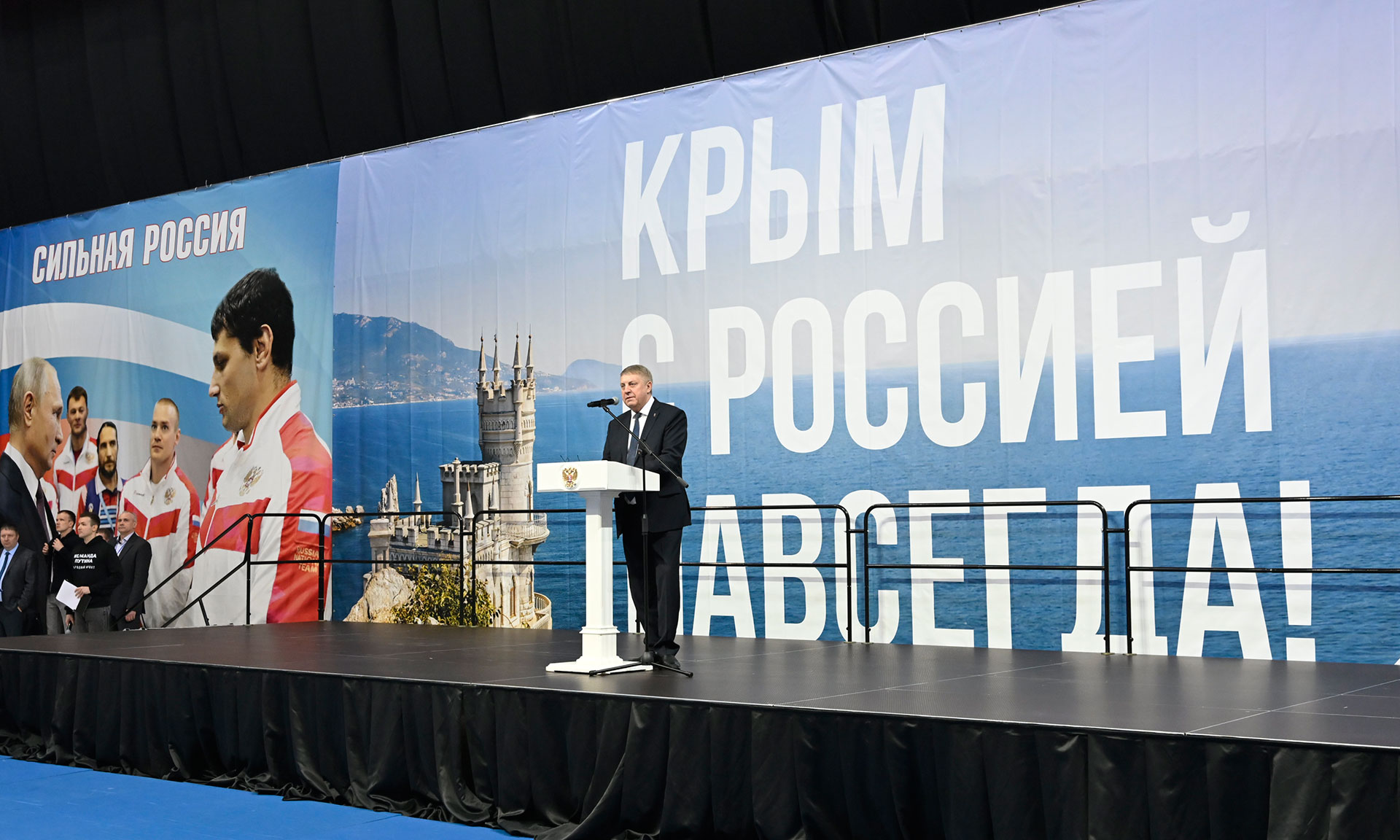 — Дорогие земляки! Сегодня мы с вами собрались в этом замечательном Дворце единоборств имени нашего прославленного земляка Артема Ивановича Осипенко, чтобы отметить 12 лет с того исторического момента, когда Крым и Севастополь вернулись в Россию.