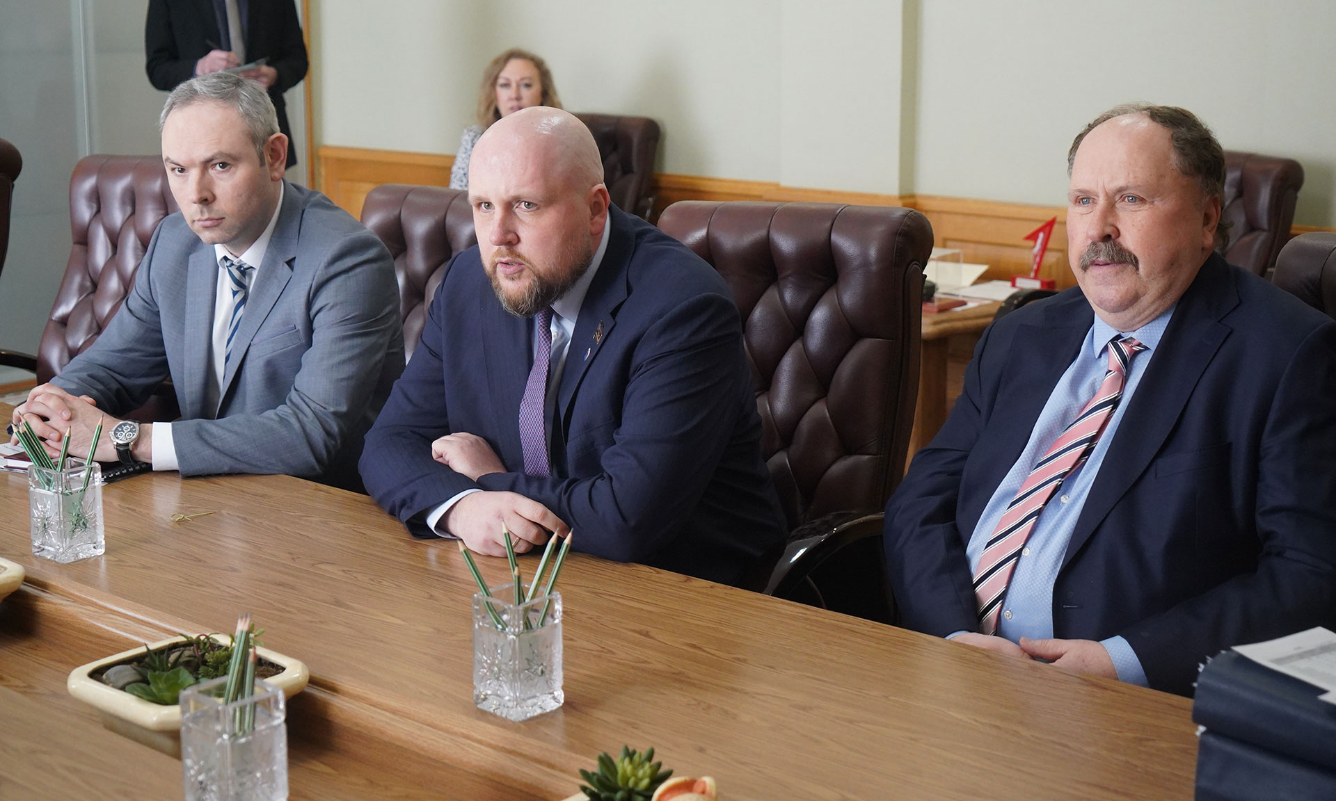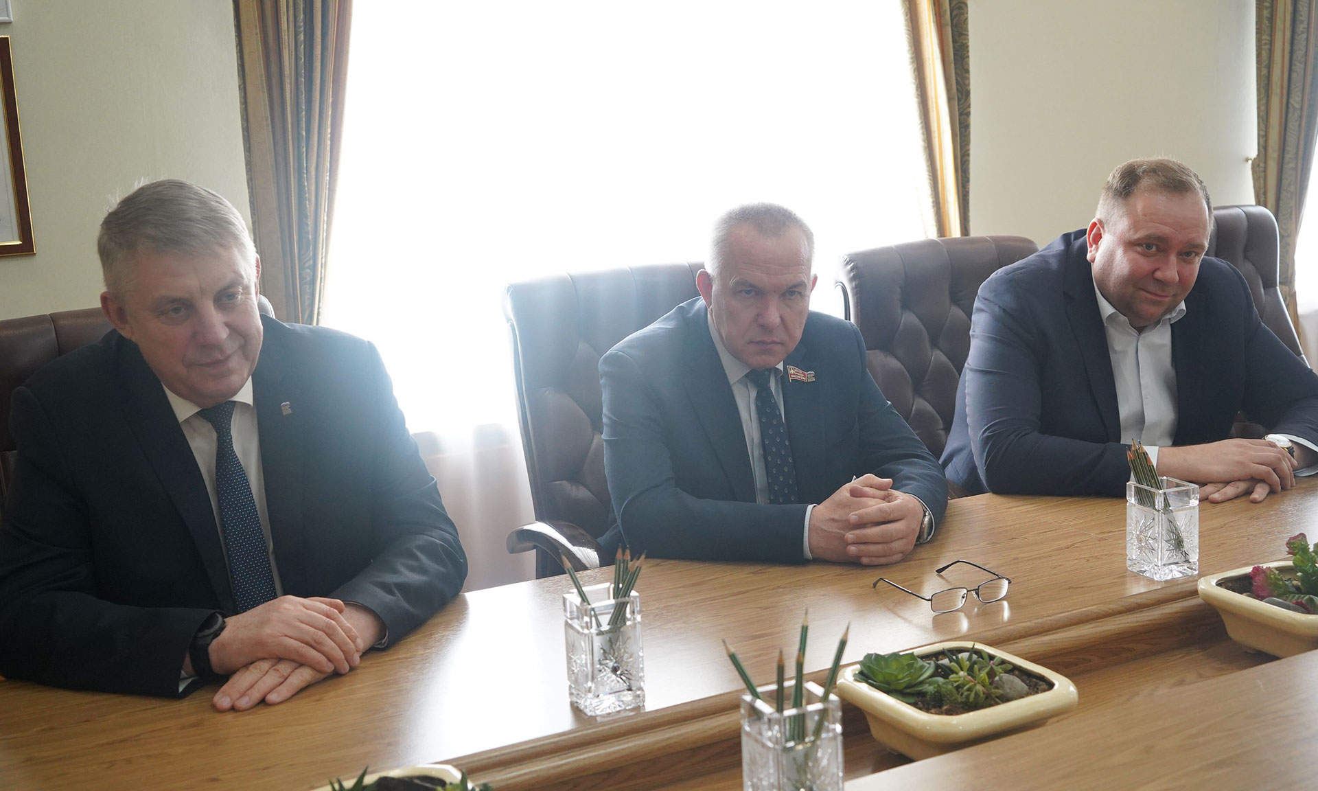 26 марта состоялась рабочая встреча Губернатора Брянской области Александра Богомаза с руководителями ООО «Научно-производственное предприятие „Александр“» Сергеем и Александром Семеновыми.