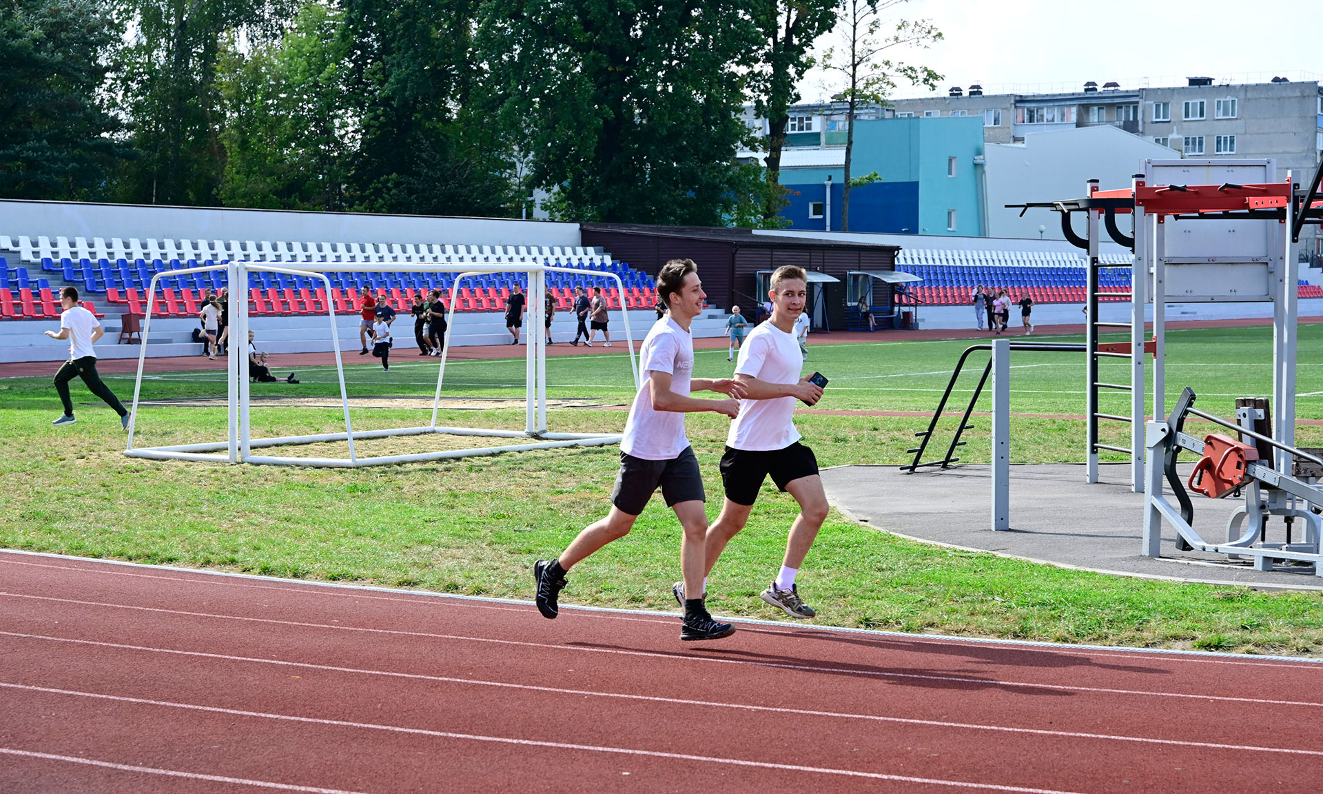 На стадионе кипит жизнь — проходят футбольные, волейбольные матчи, тренировки и соревнования легкоатлетов. 130 ребят занимаются в секции легкой атлетики, и уже есть хорошие результаты на всероссийских соревнованиях и чемпионатах ЦФО.