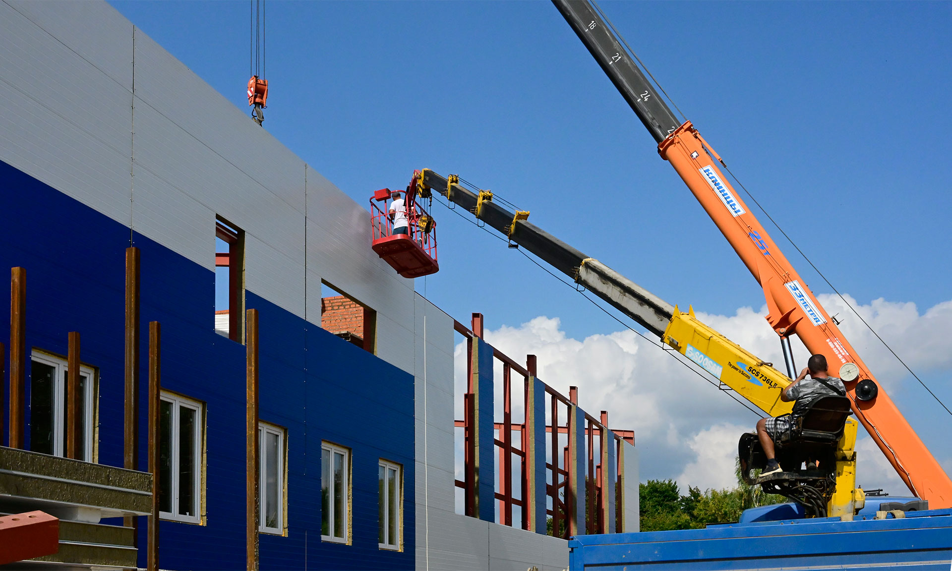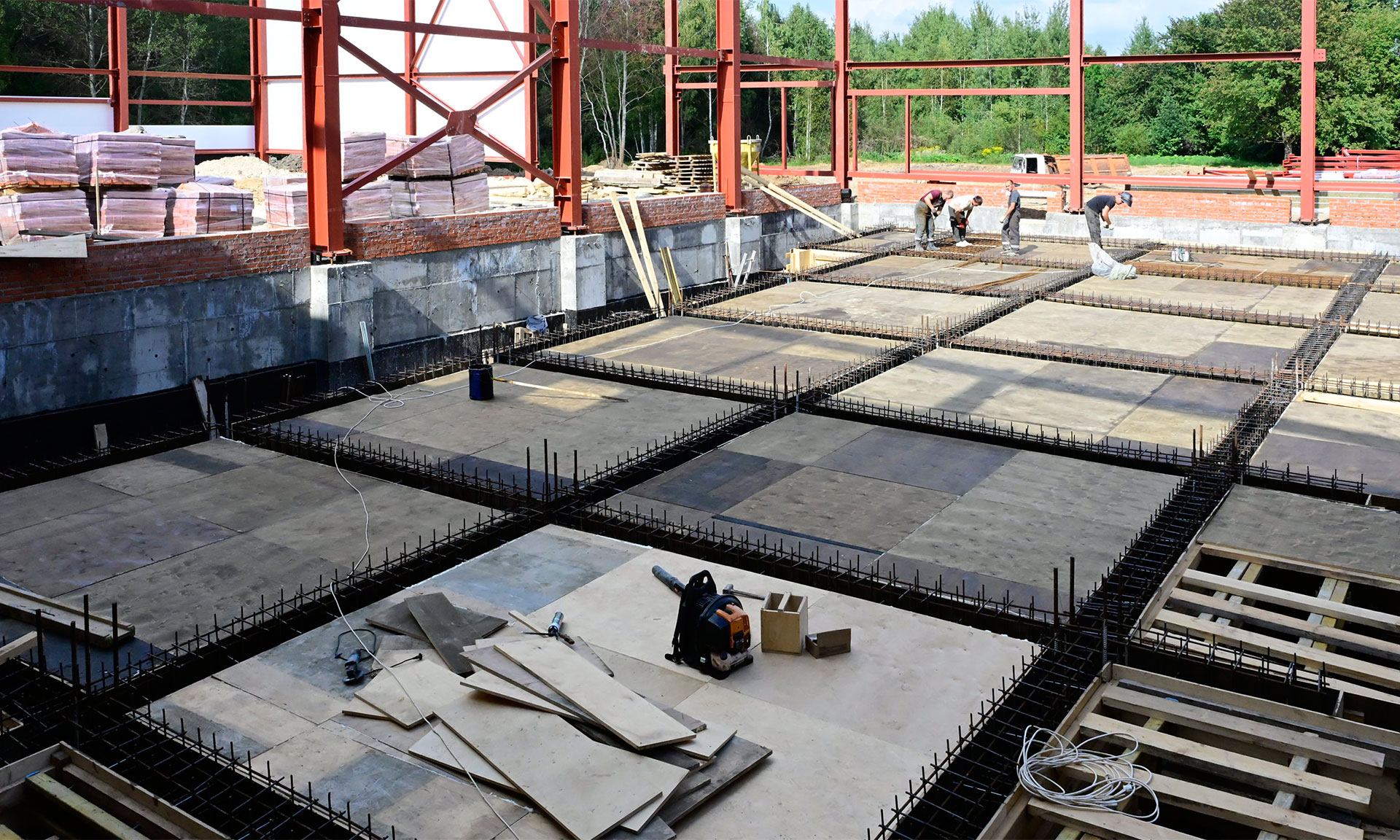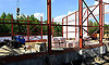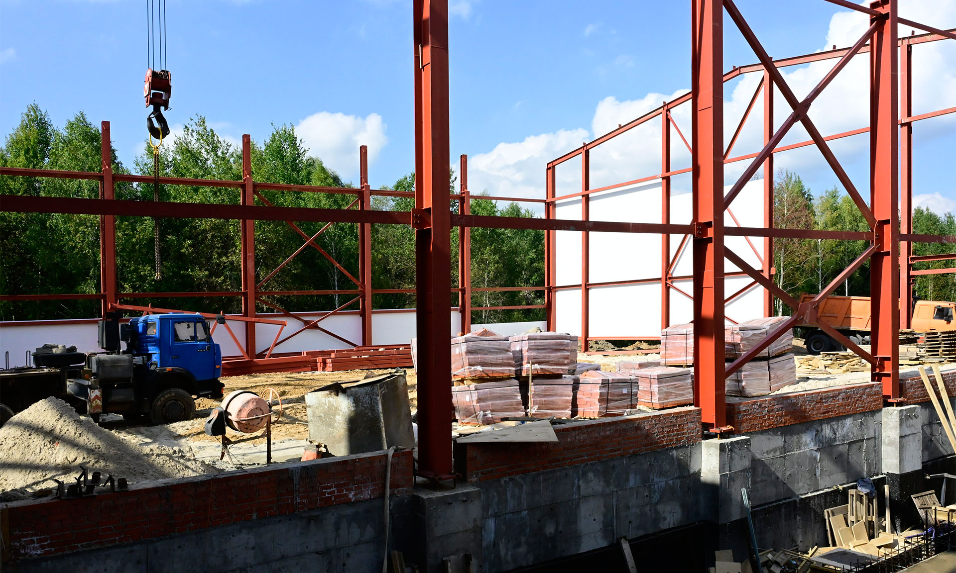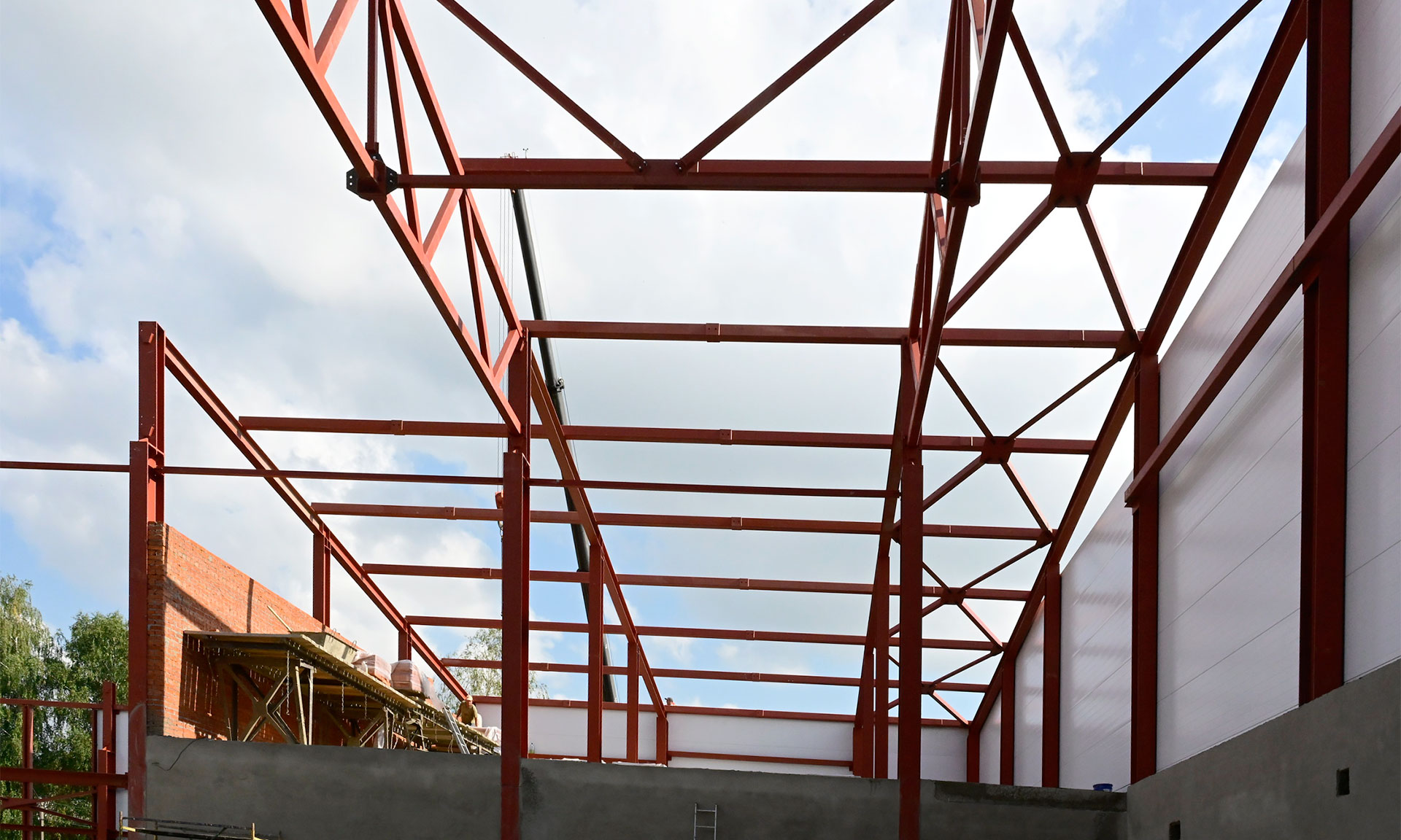 Ведутся работы по монтажу ферм для кровли, стеновых панелей, чаши бассейна. Но темп работ оставляет желать лучшего — есть отставание от графика, нужно увеличить количество людей на объекте.